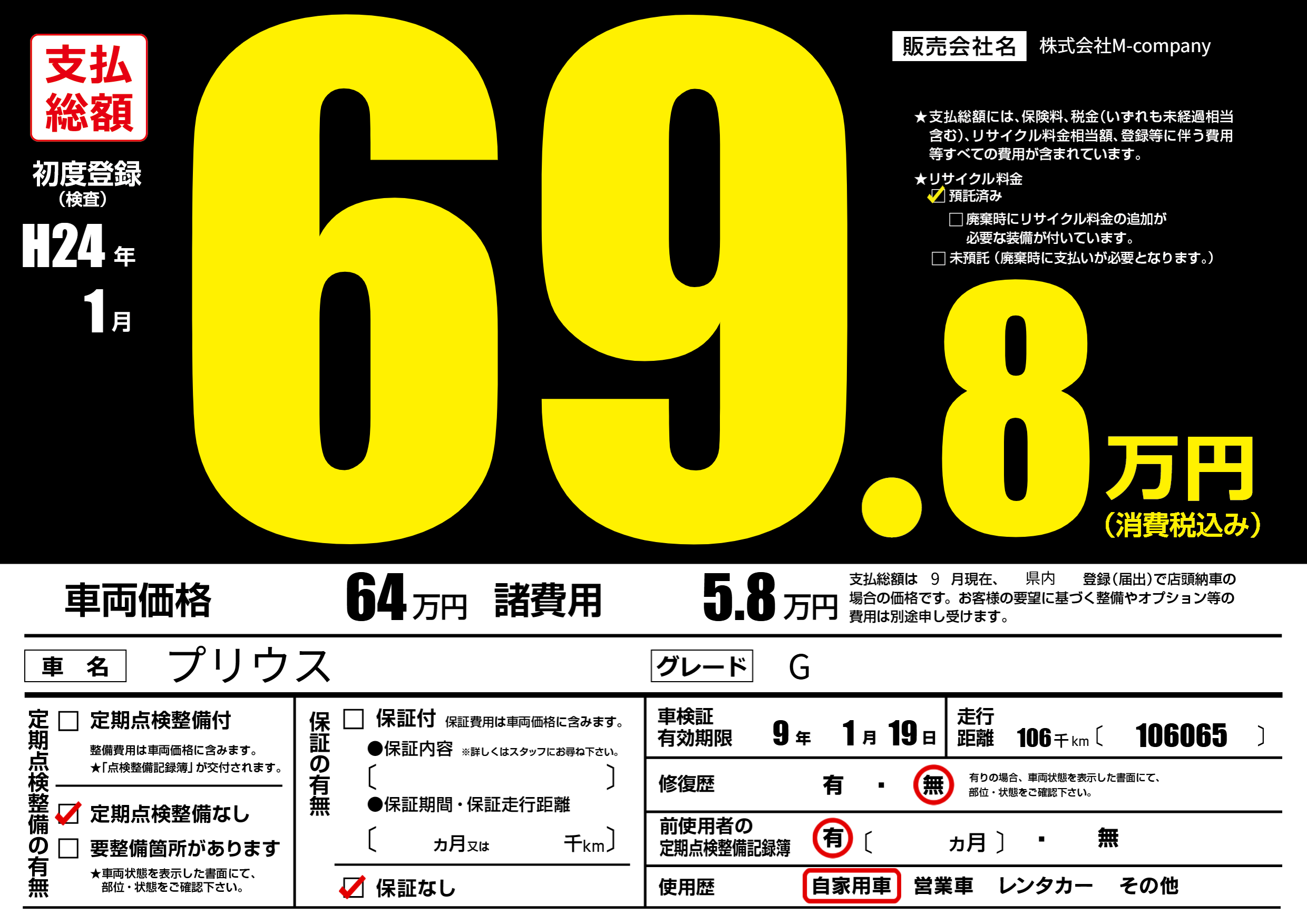 なし | 車検制限 | 9年1月19月 |