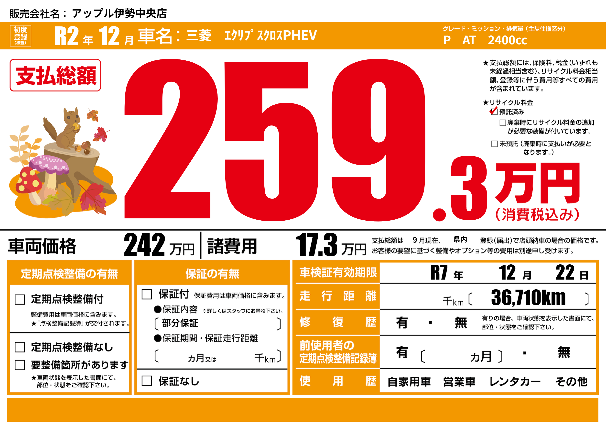 | 車名 | 三菱 エクリプスクロスPHEV | グレード ミッション 排気量 |