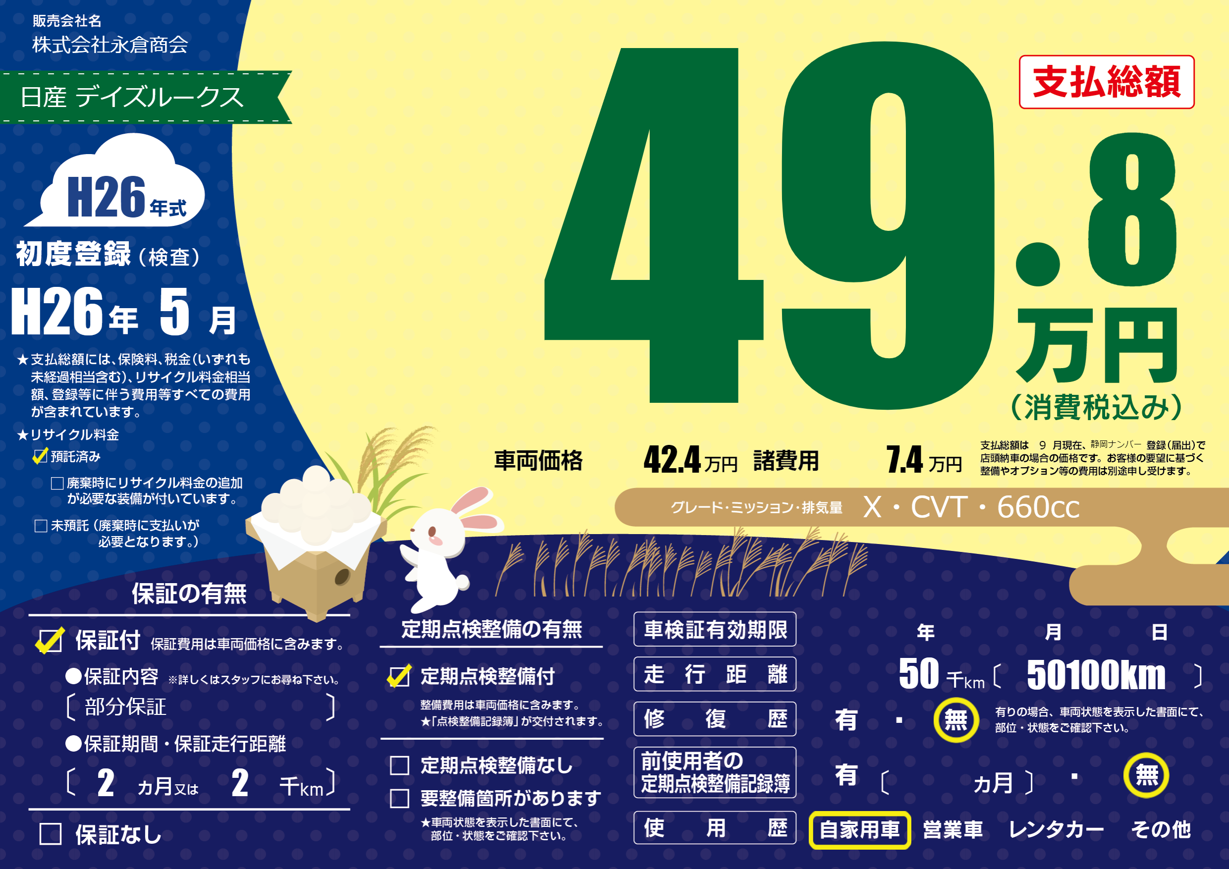 | 走行キロ | 5万km | 初年度登録 | H26年5月 |