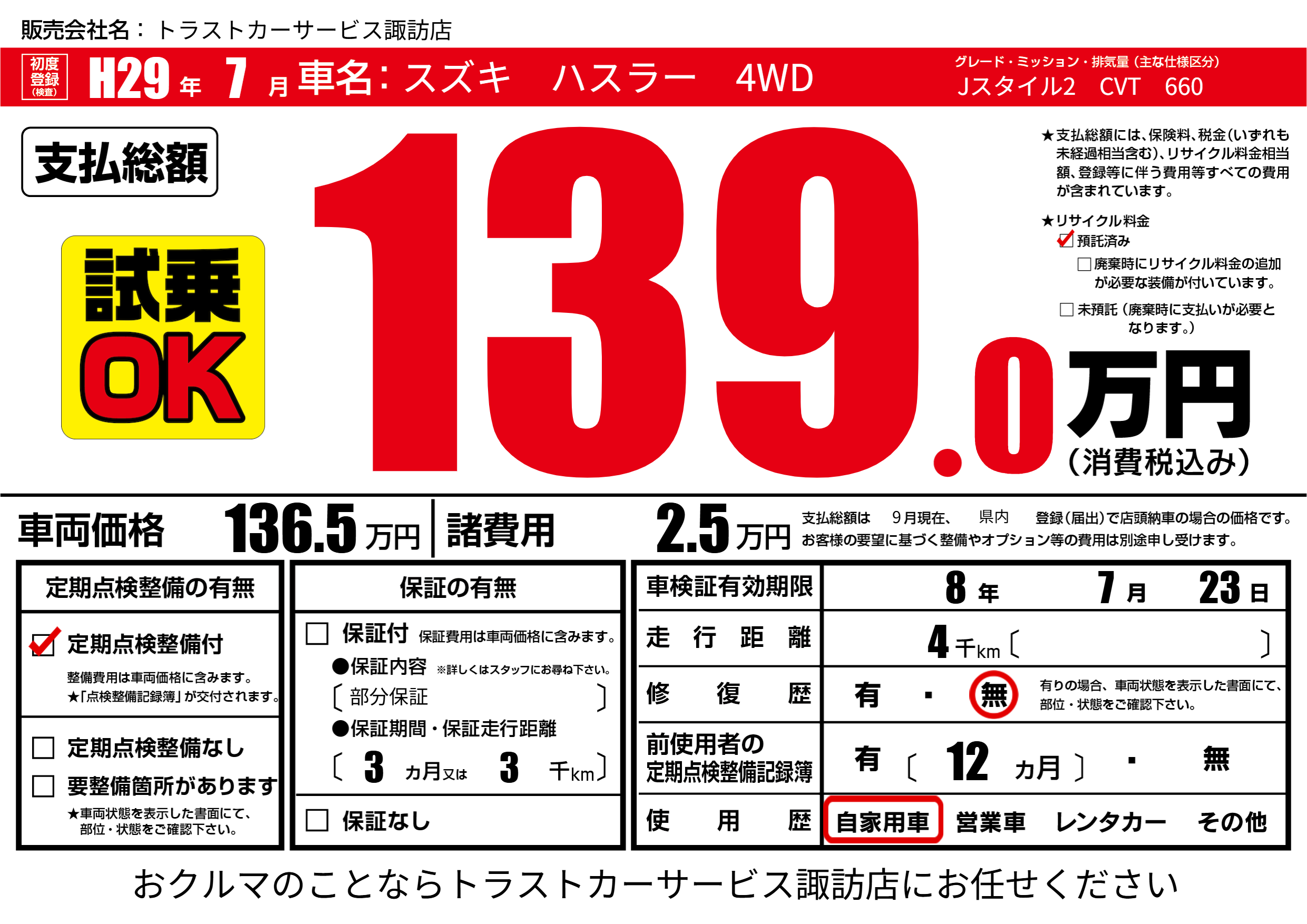 | 車名 | スズキ ハスラー 4WD | グレード ミッション 排気量 |