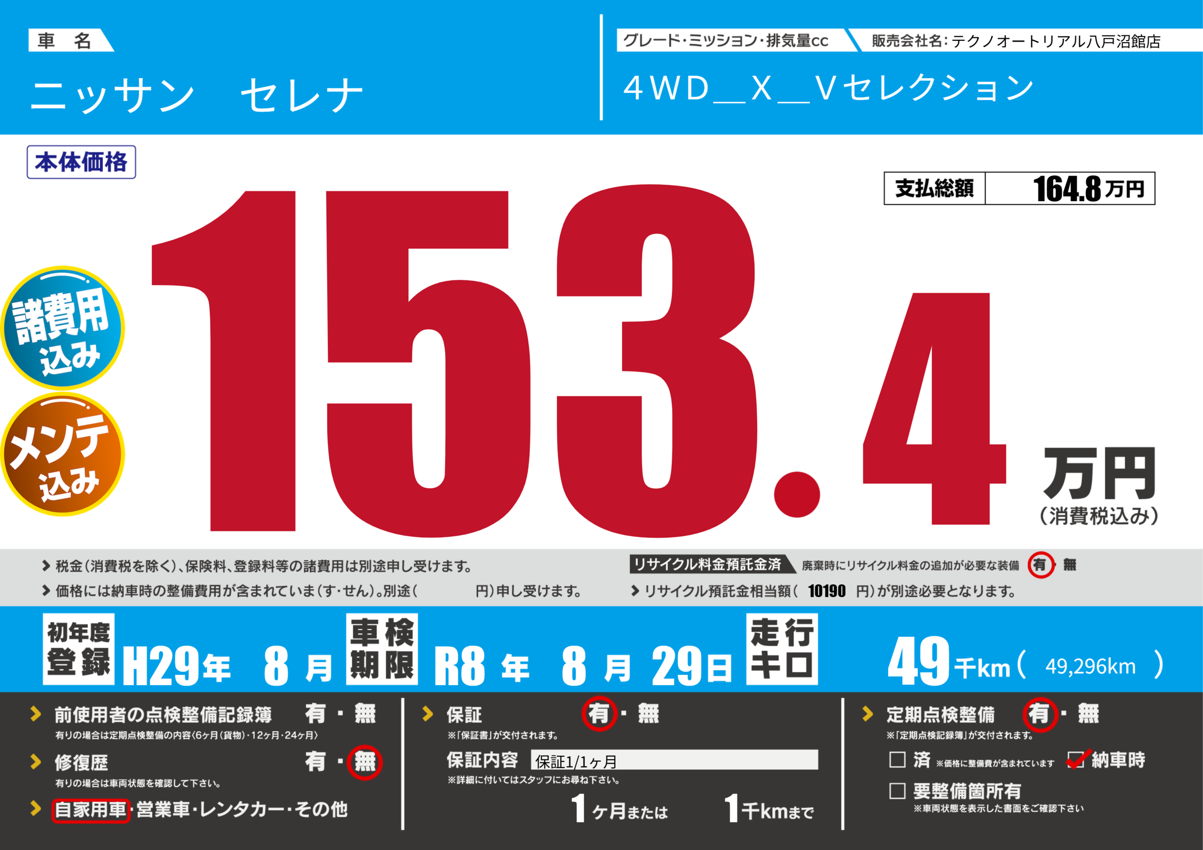 | 走行キロ | 4.9万km | 初年度登録 | H29年8月 |