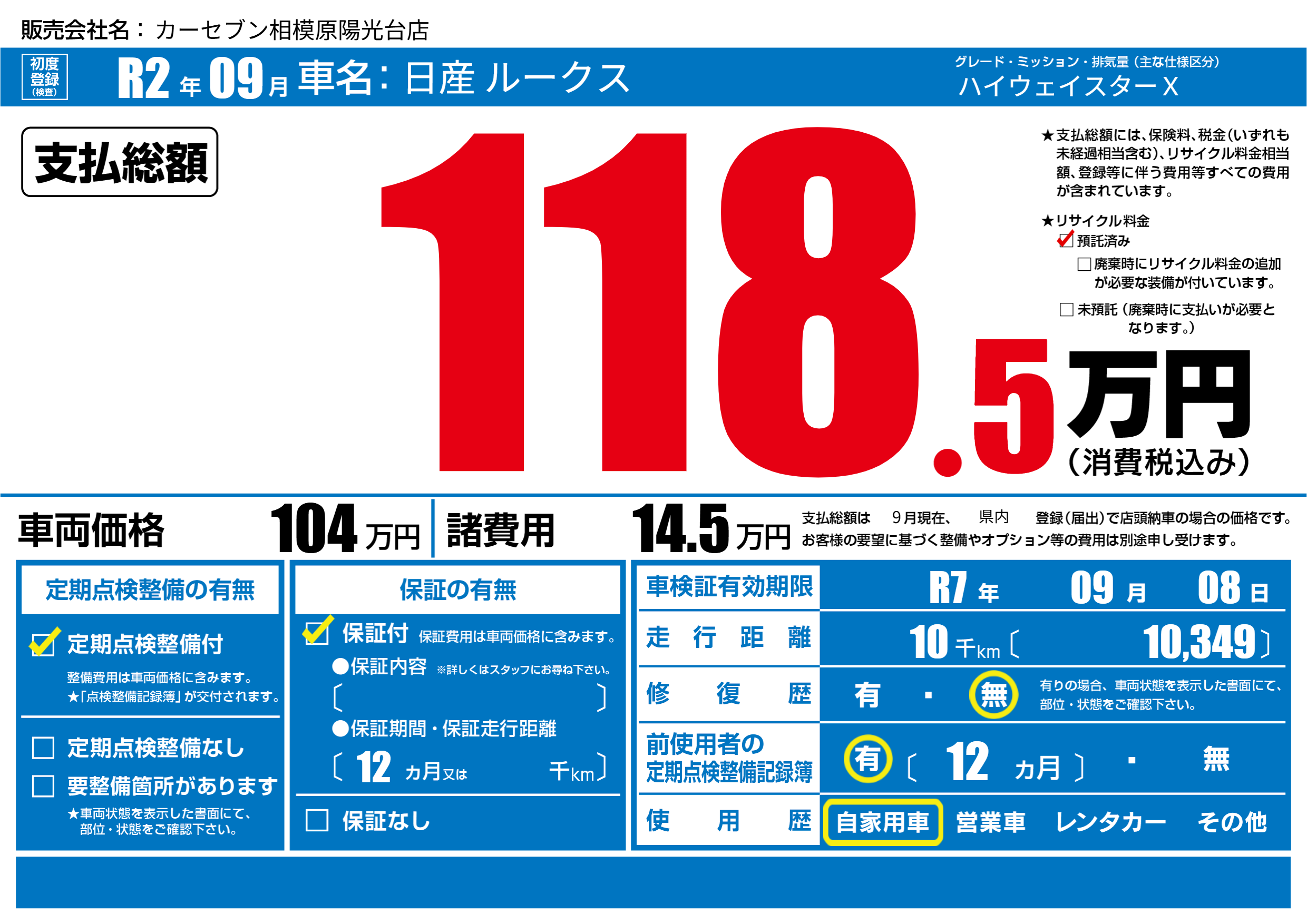 | 走行キロ | 1万km | 初年度登録 | R2年09月 |