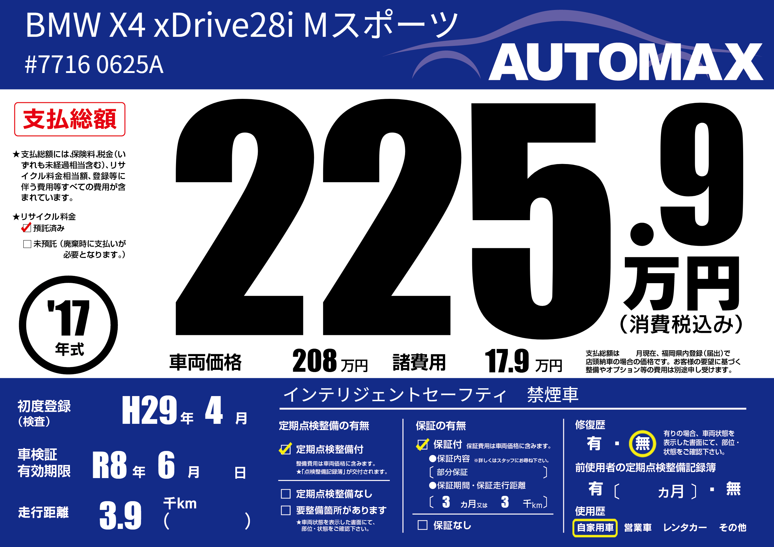 | 車名 | BMW X4 xDrive28i Mスポーツ | グレード ミッション 排気量 |