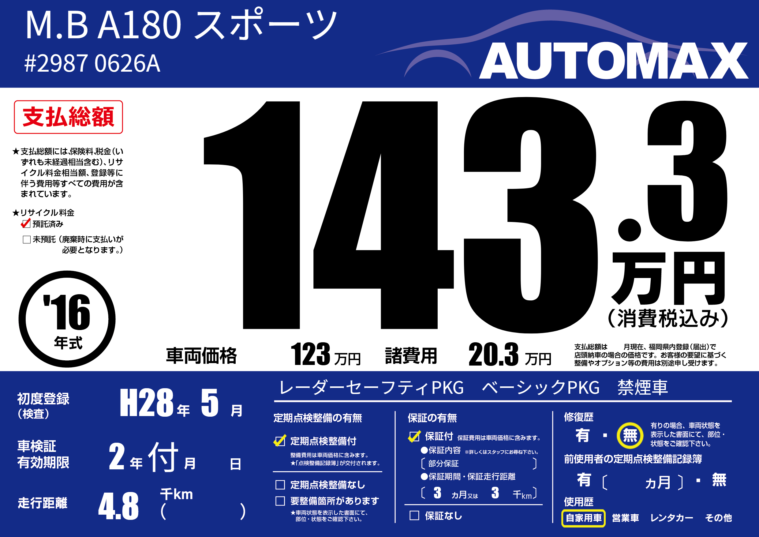 | 走行キロ | 0.4万km | 初年度登録 | H28年5月 |