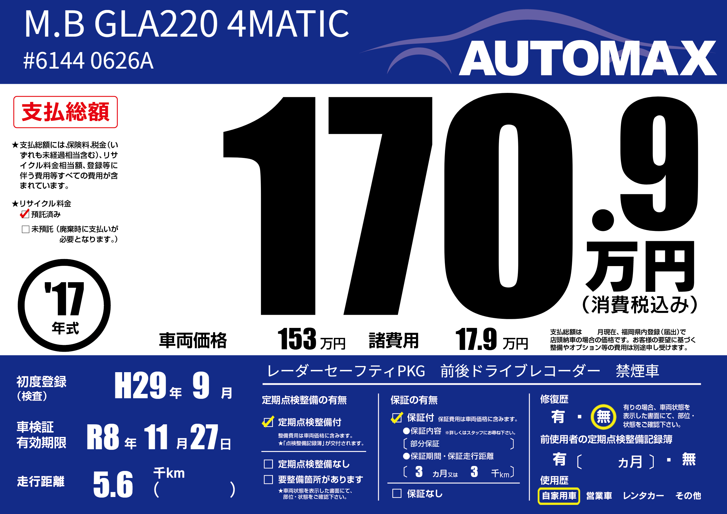 | 車名 | M.B GLA220 4MATIC | グレード ミッション 排気量 |