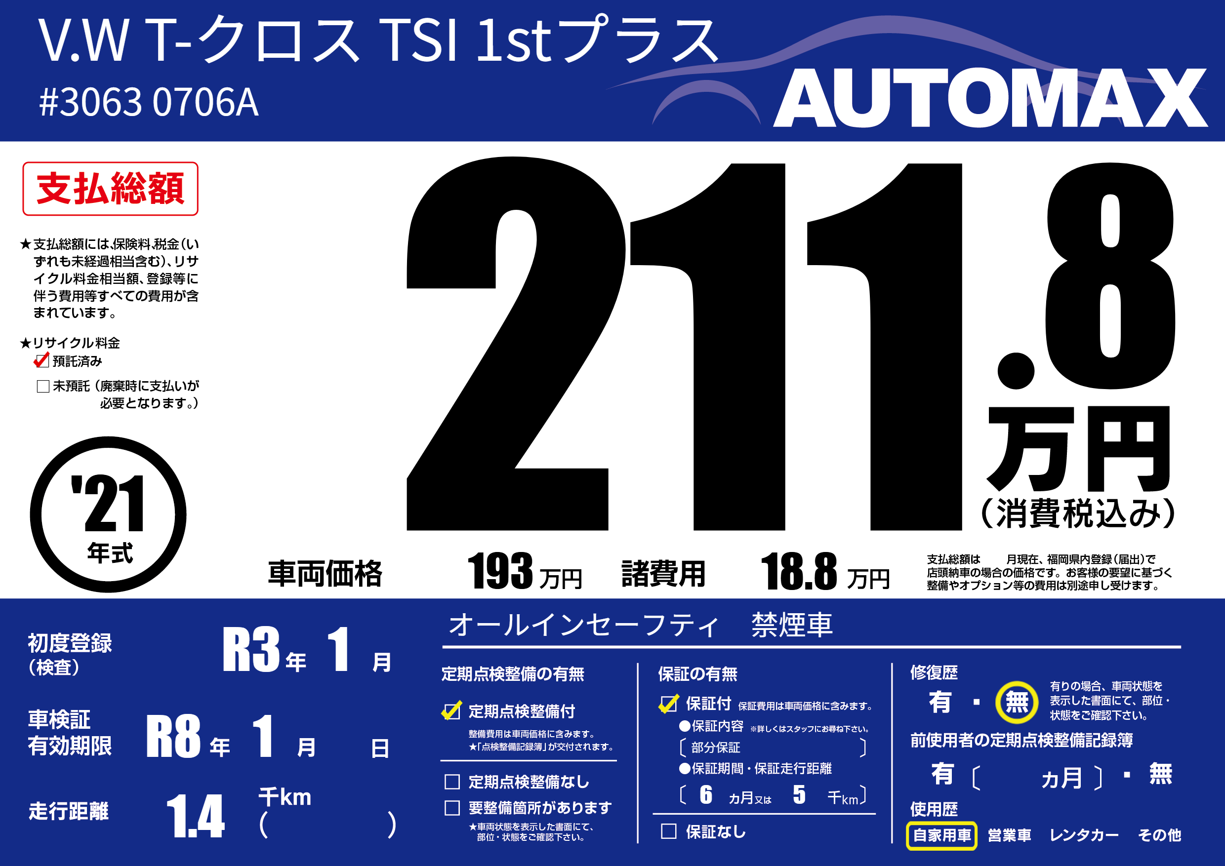 | 車名 | V.W T-クロス TSI 1stプラス | グレード ミッション 排気量 |