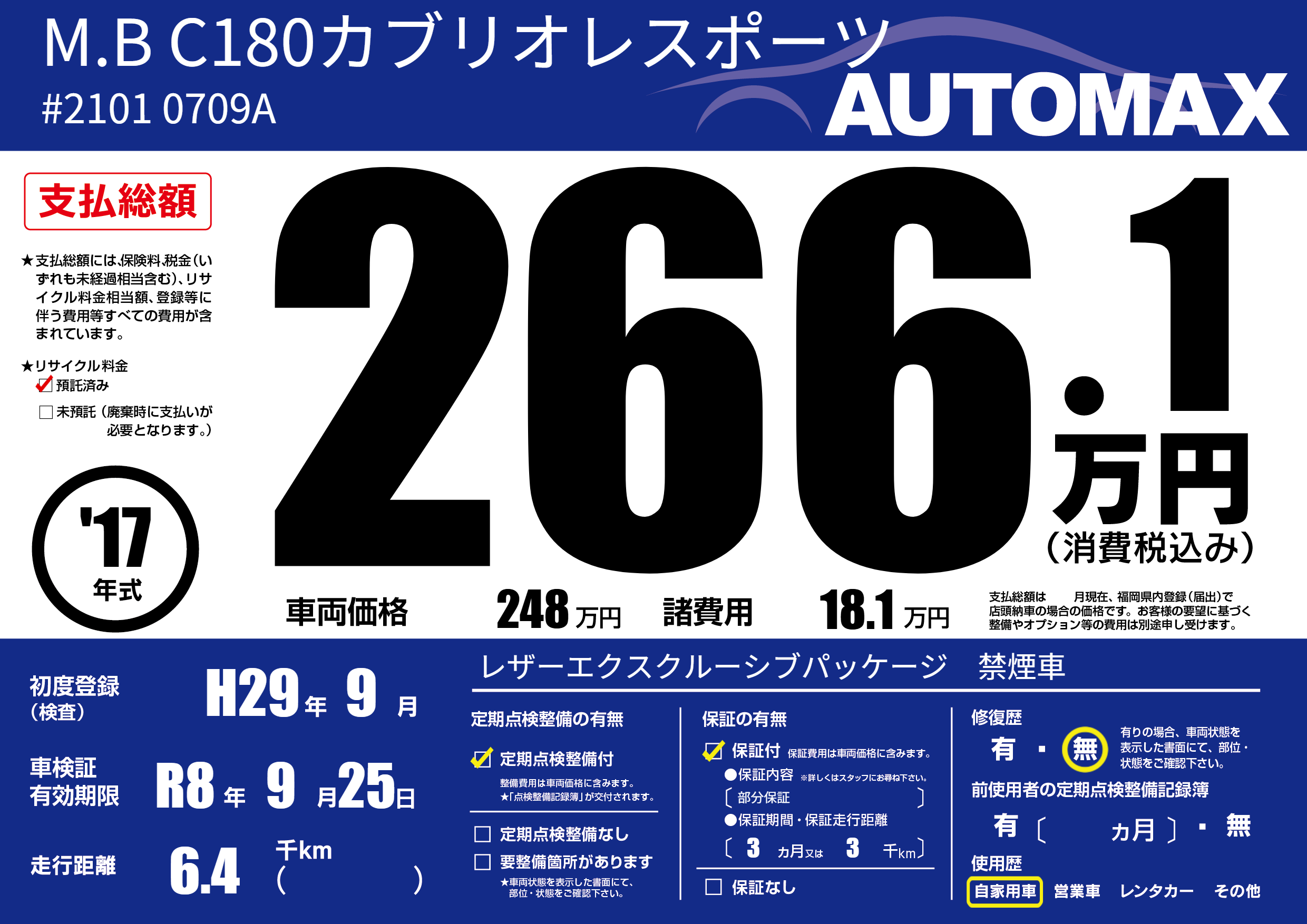 | 車名 | M.B C180カブリオレスポーツ | グレード ミッション 排気量 |
