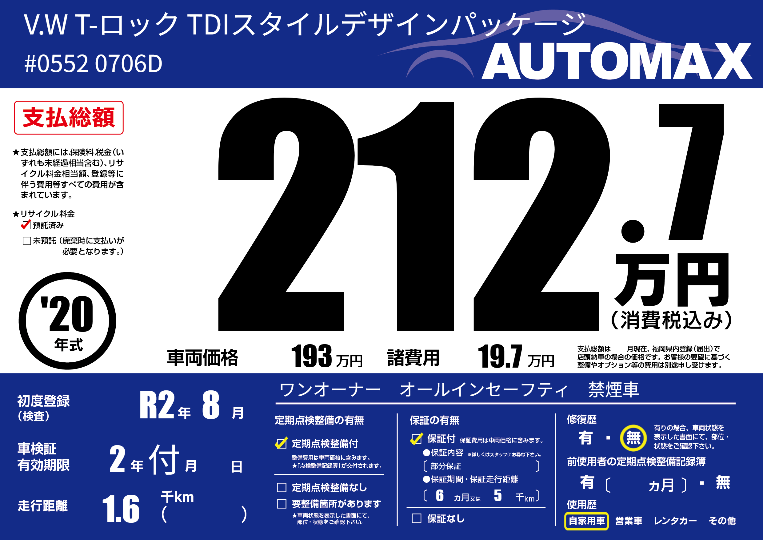| 車名 | V.W T-ロック TDIスタイルデザインパッケージ | グレード ミッション 排気量 |