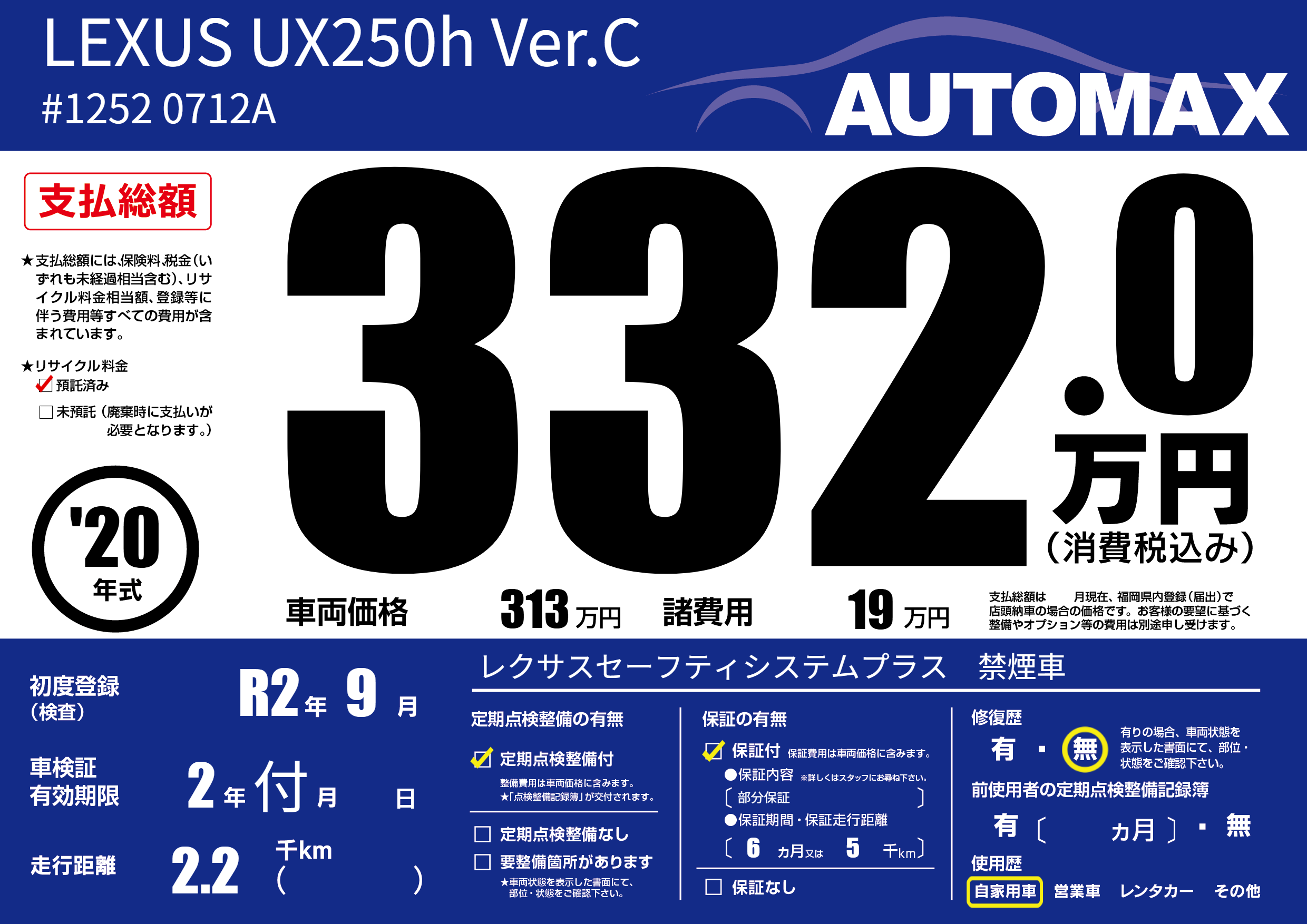 | 車名 | LEXUS UX250h Ver.C | グレード ミッション 排気量 |