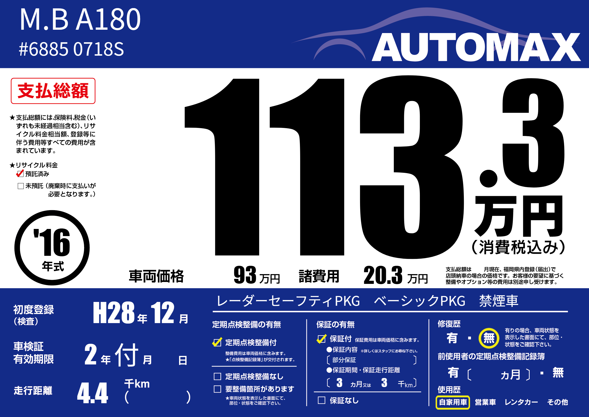 | 車名 | M.B A180 | グレード ミッション 排気量 |