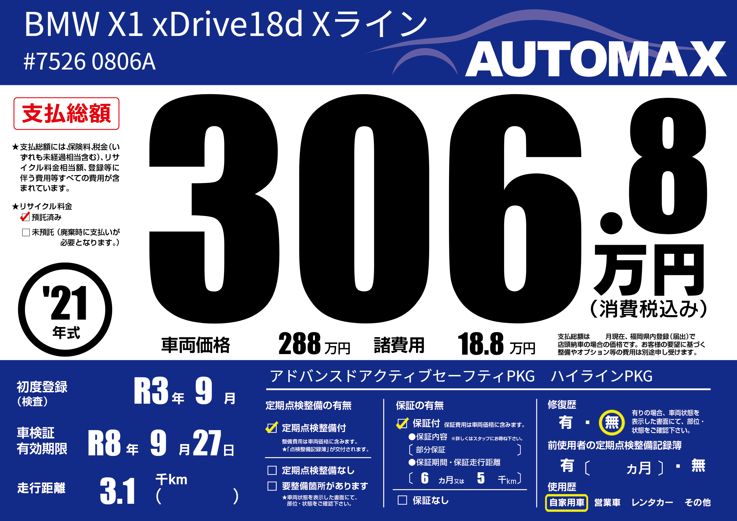 | 走行キロ | 0.3万km | 初年度登録 | R3年9月 |