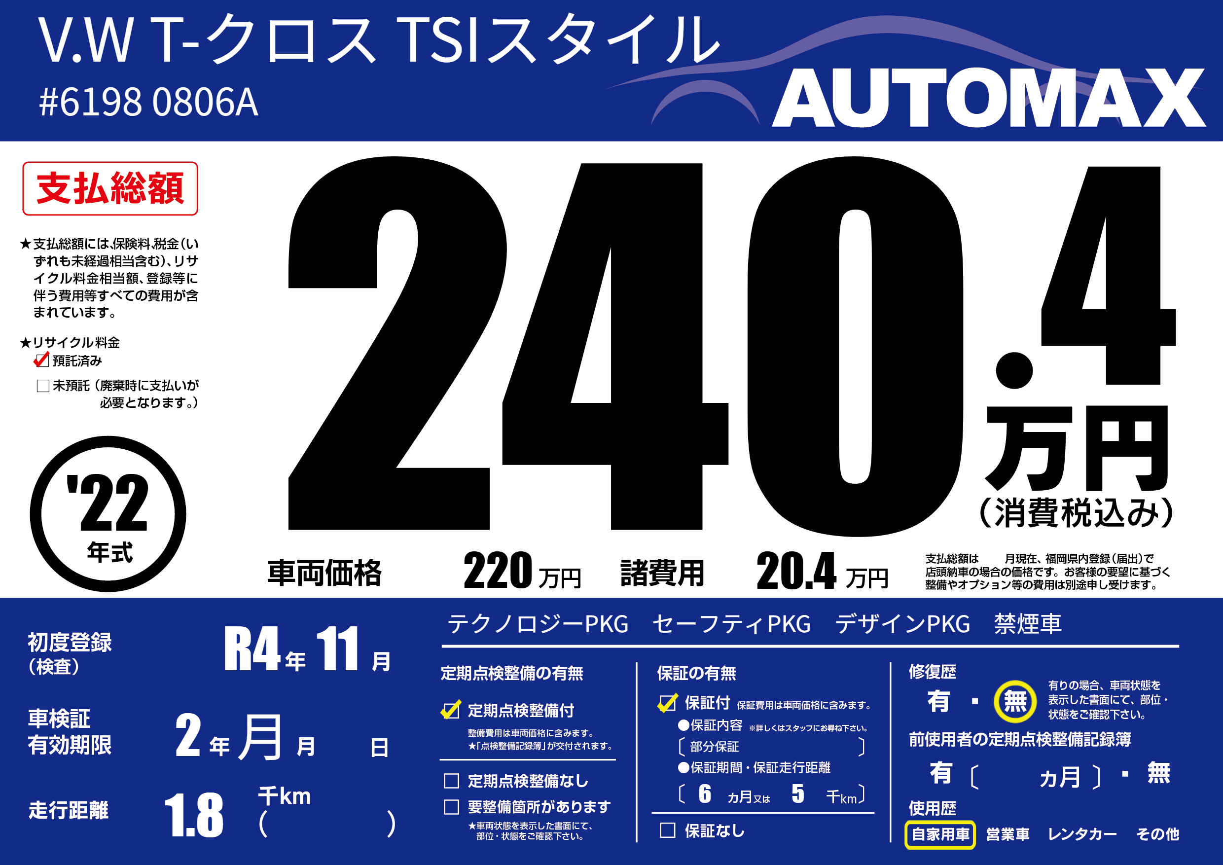 | 車名 | V.W T-クロス TSIスタイル | グレード ミッション 排気量 |