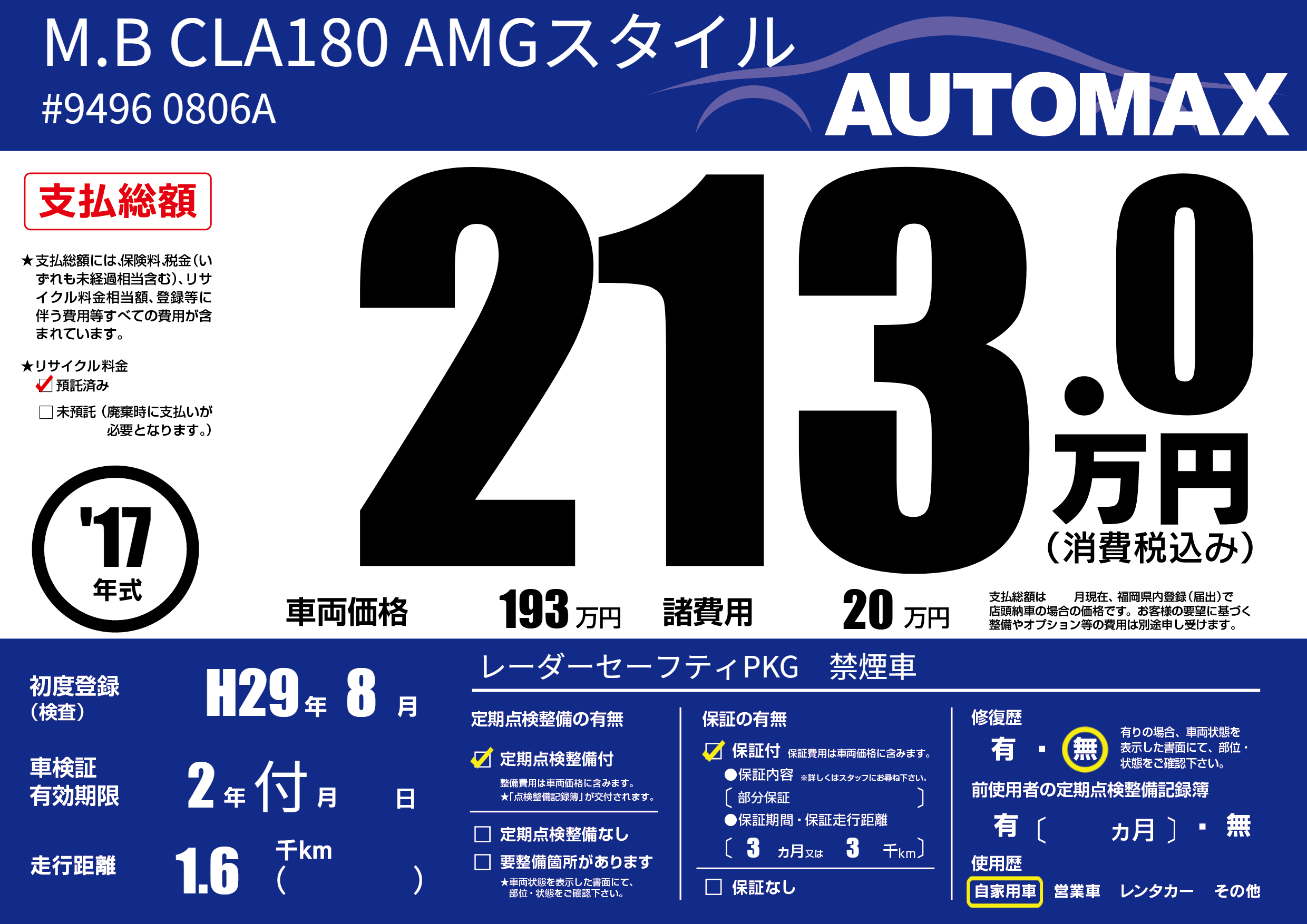 | 車名 | M.B CLA180 AMGスタイル | グレード ミッション 排気量 |