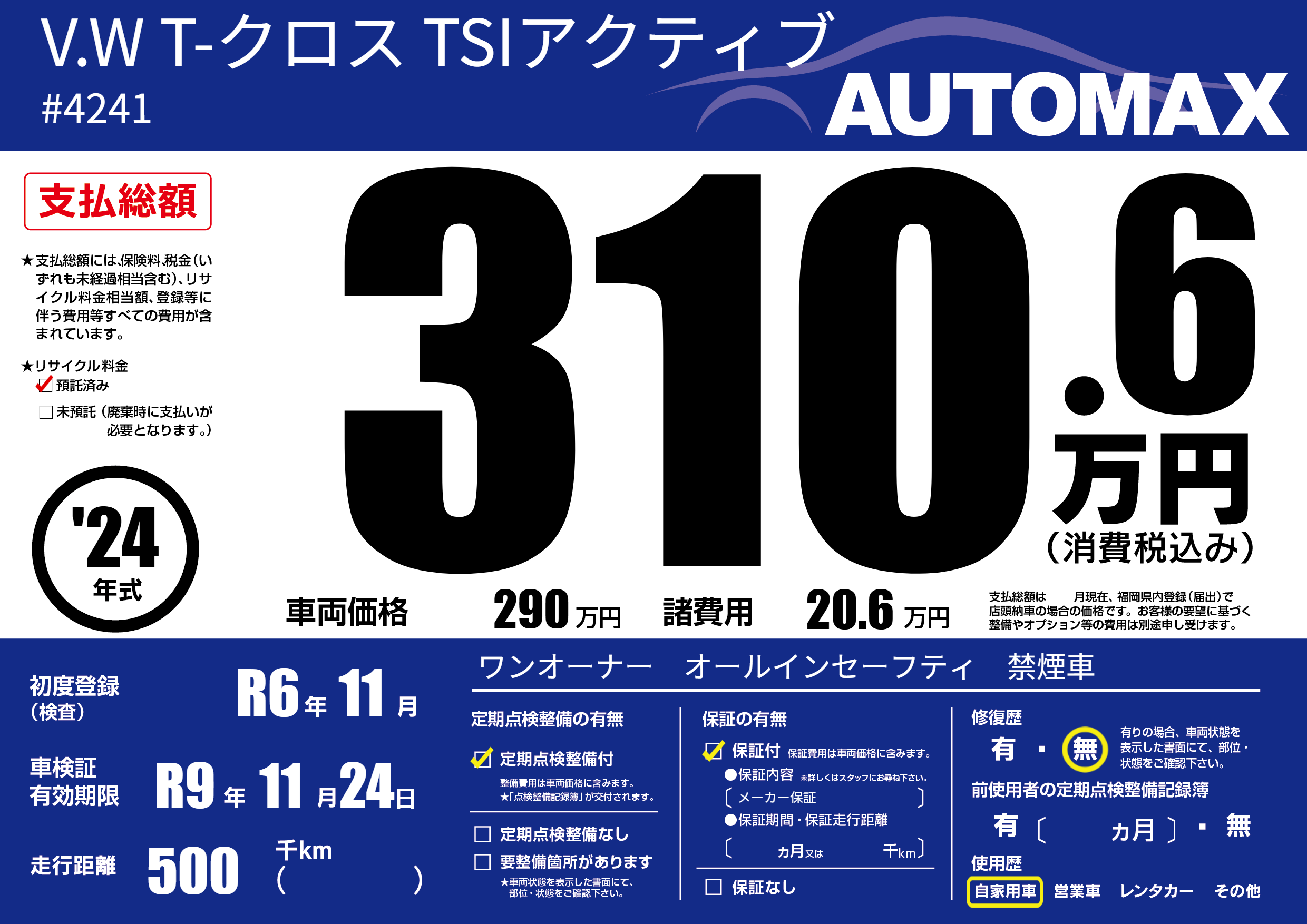 | 車名 | V.W T-クロス TSIアクティブ | グレード ミッション 排気量 |