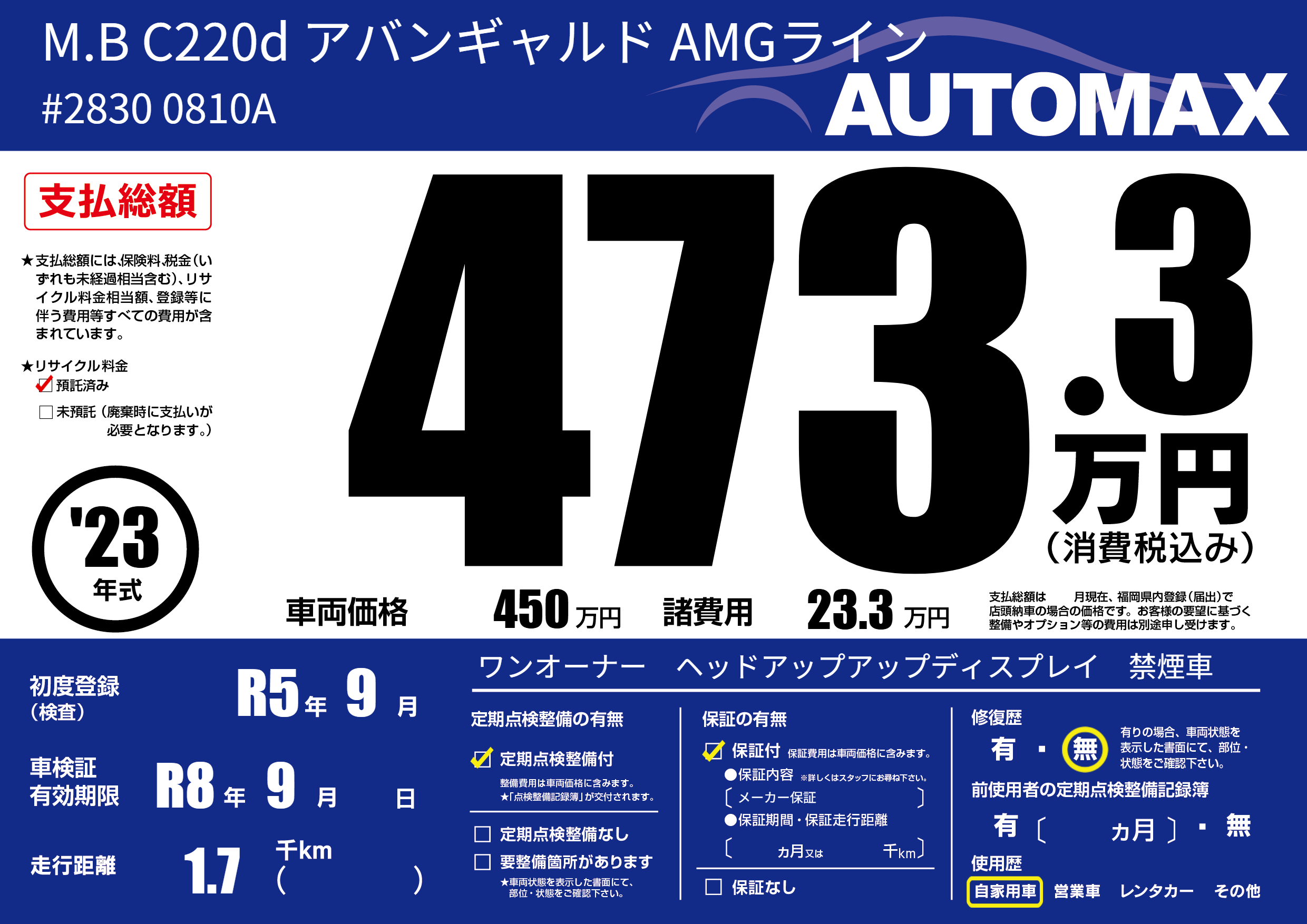 | 車名 | M.B C220d アバンギャルド AMGライン | グレード ミッション 排気量 |