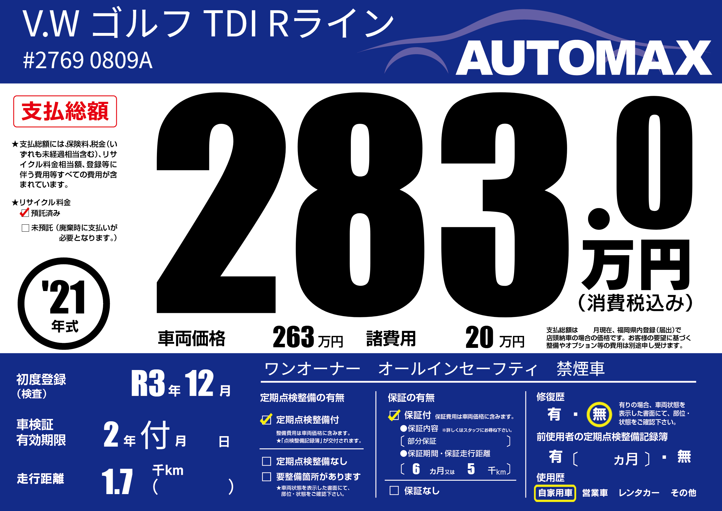 | 車名 | V.W ゴルフ TDI Rライン | グレード ミッション 排気量 |