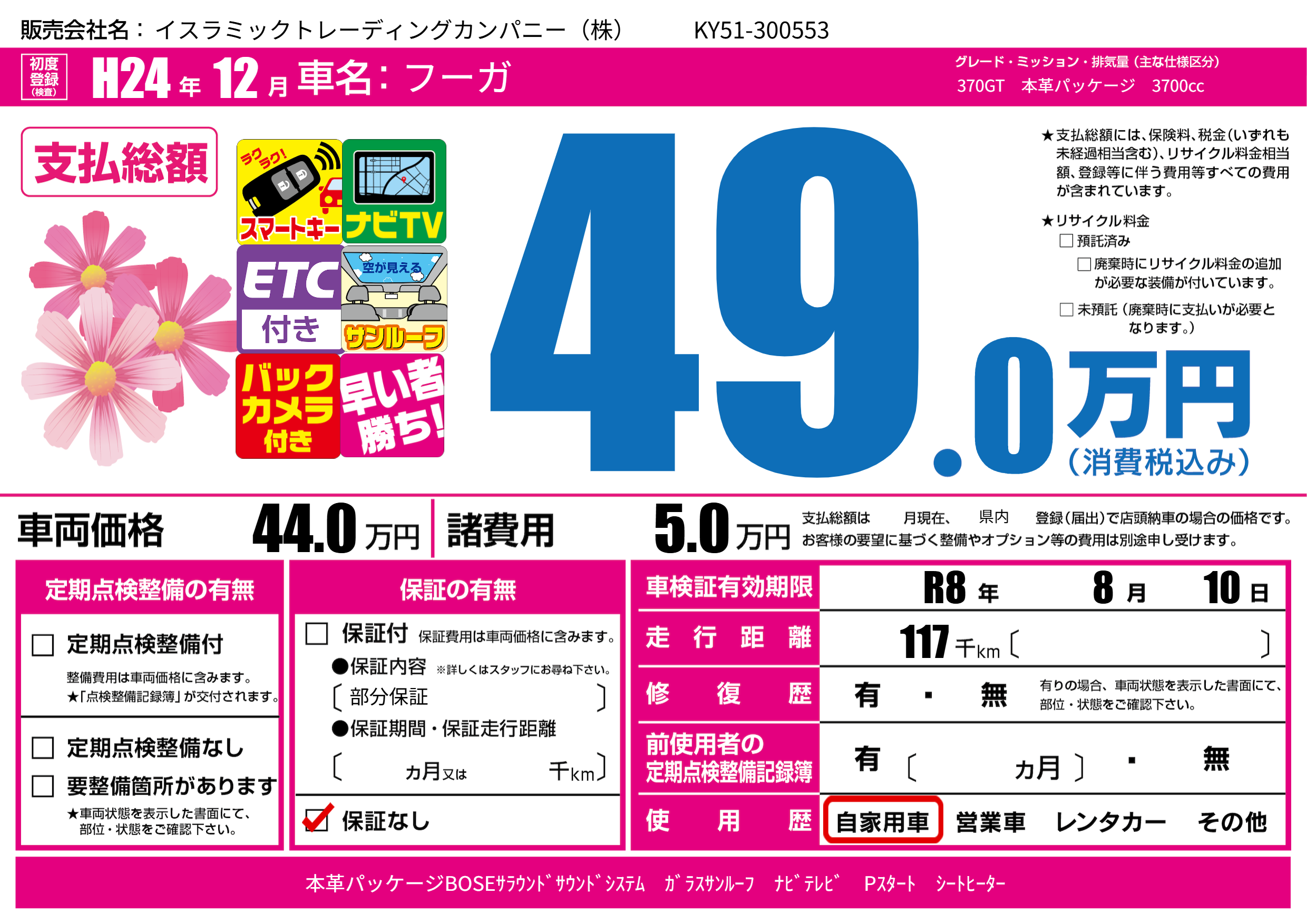 | 車名 | フーガ | グレード ミッション 排気量 |
