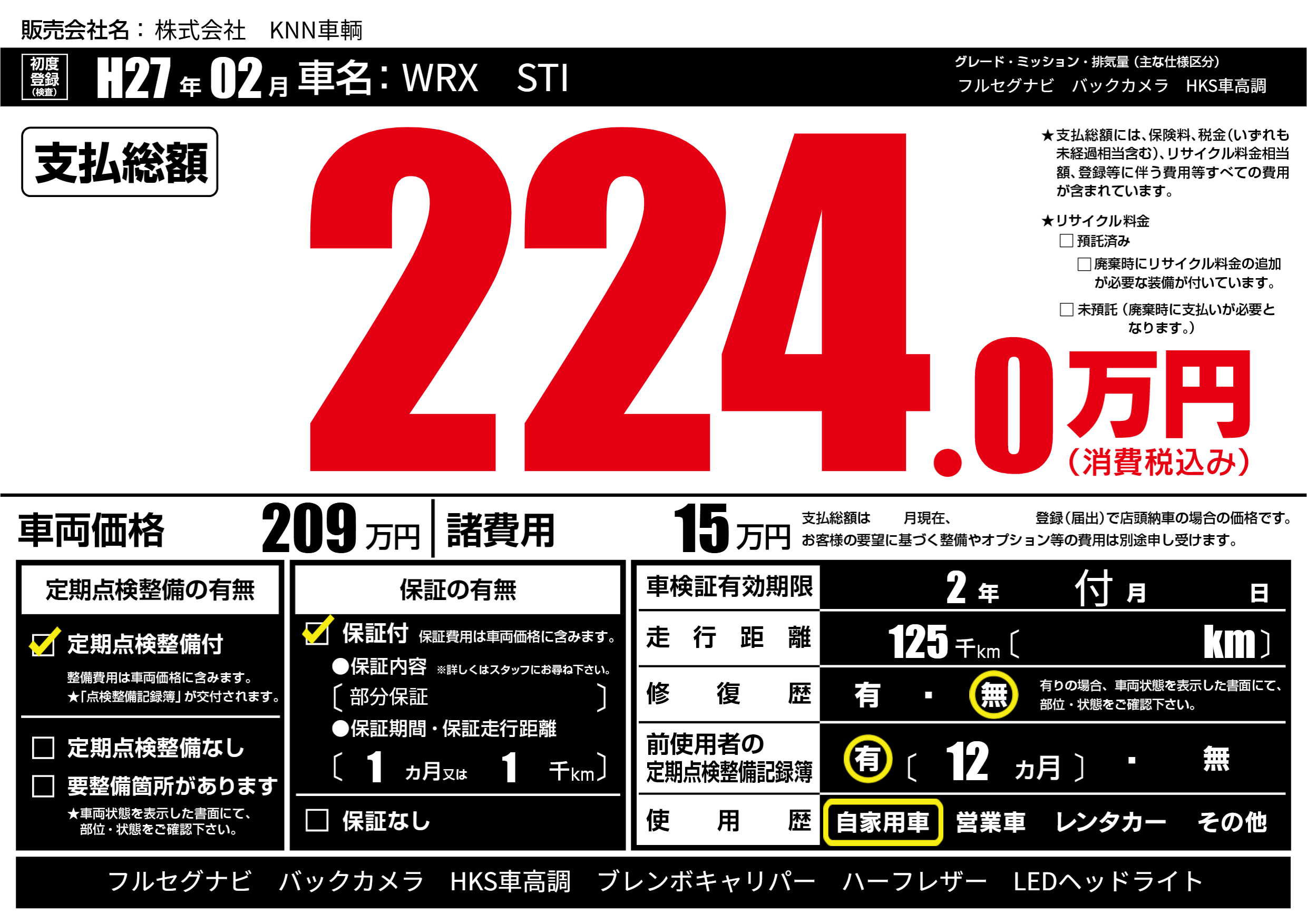| 車名 | WRX STI | グレード ミッション 排気量 |