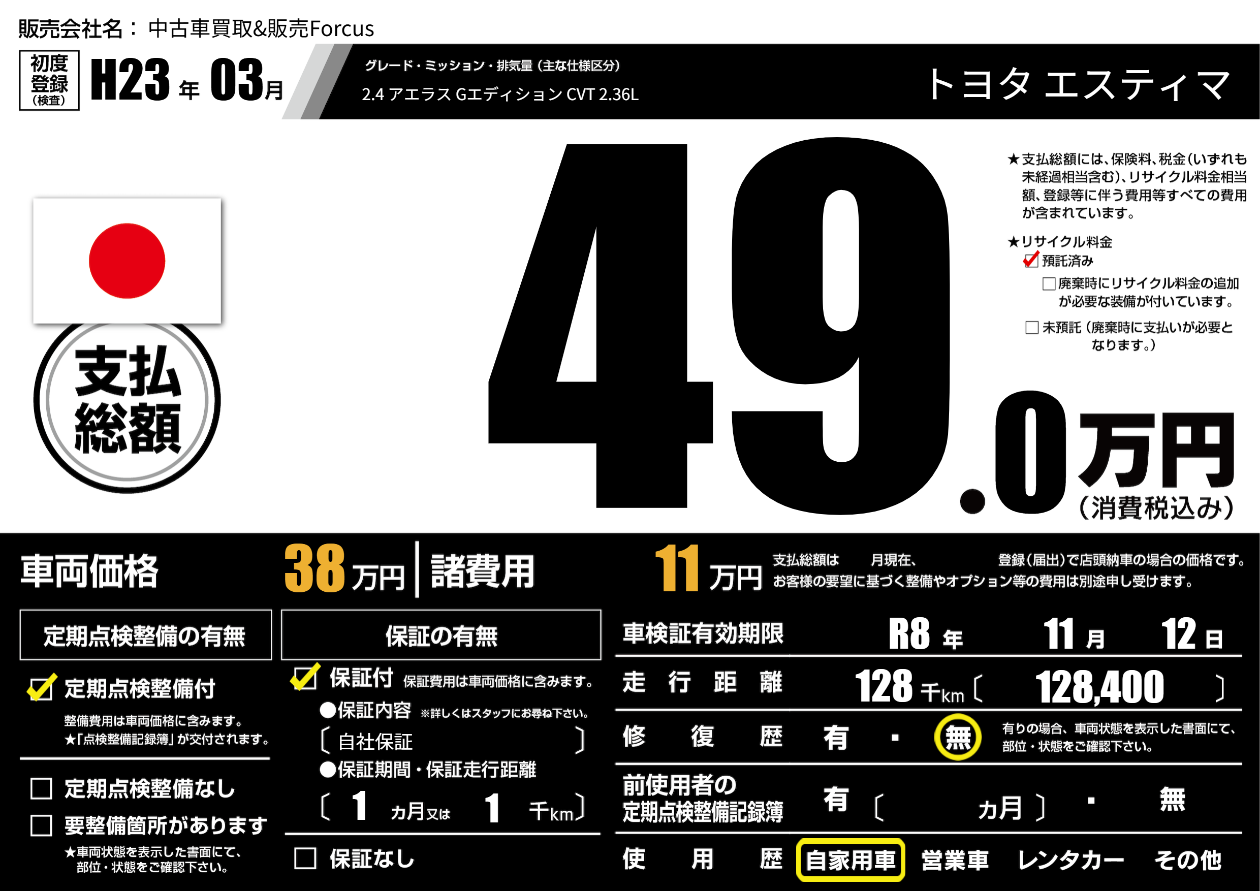 | 走行キロ | 12.8万km | 初年度登録 | H23年03月 |