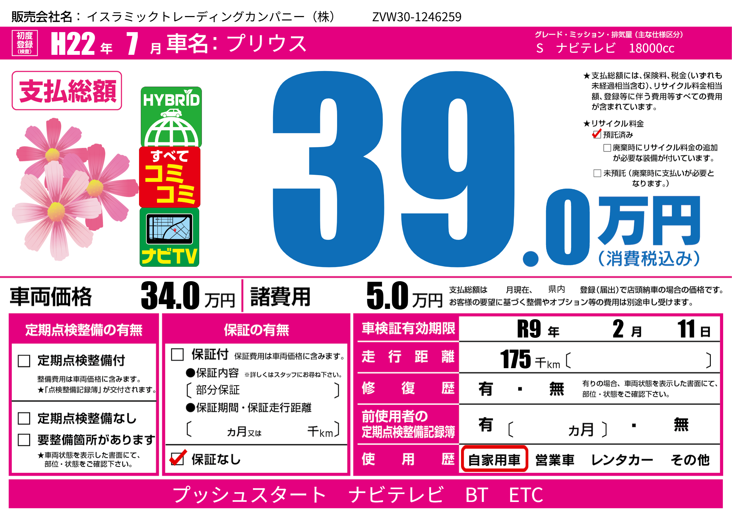 | 車名 | プリウス | グレード ミッション 排気量 |
