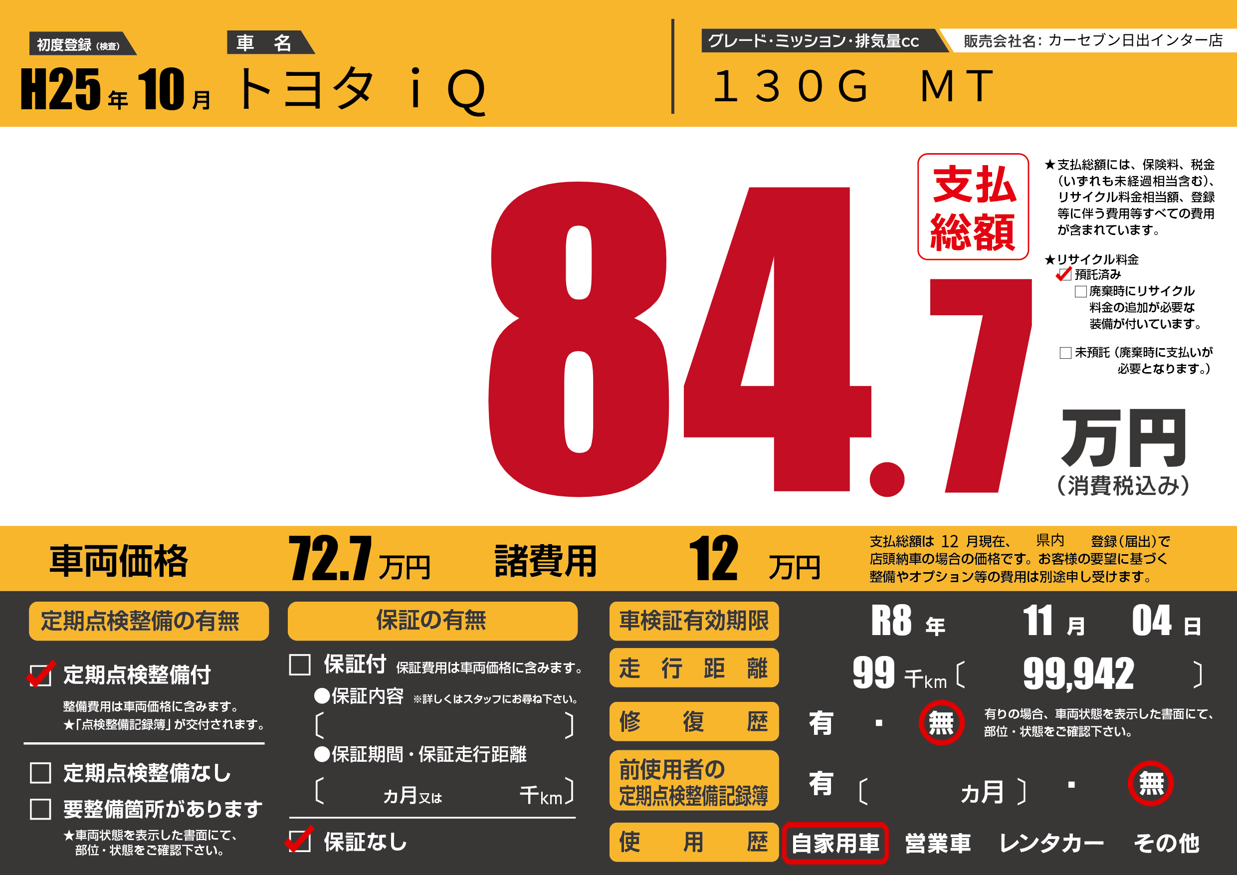 | 車名 | トヨタ iQ | グレード ミッション 排気量 |