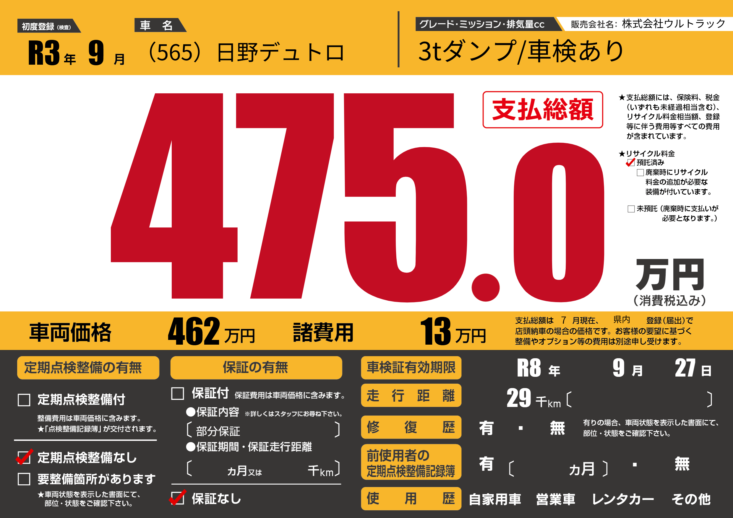 保証なし 保証内容(部分保証) ---ヶ月または()千kmまで |