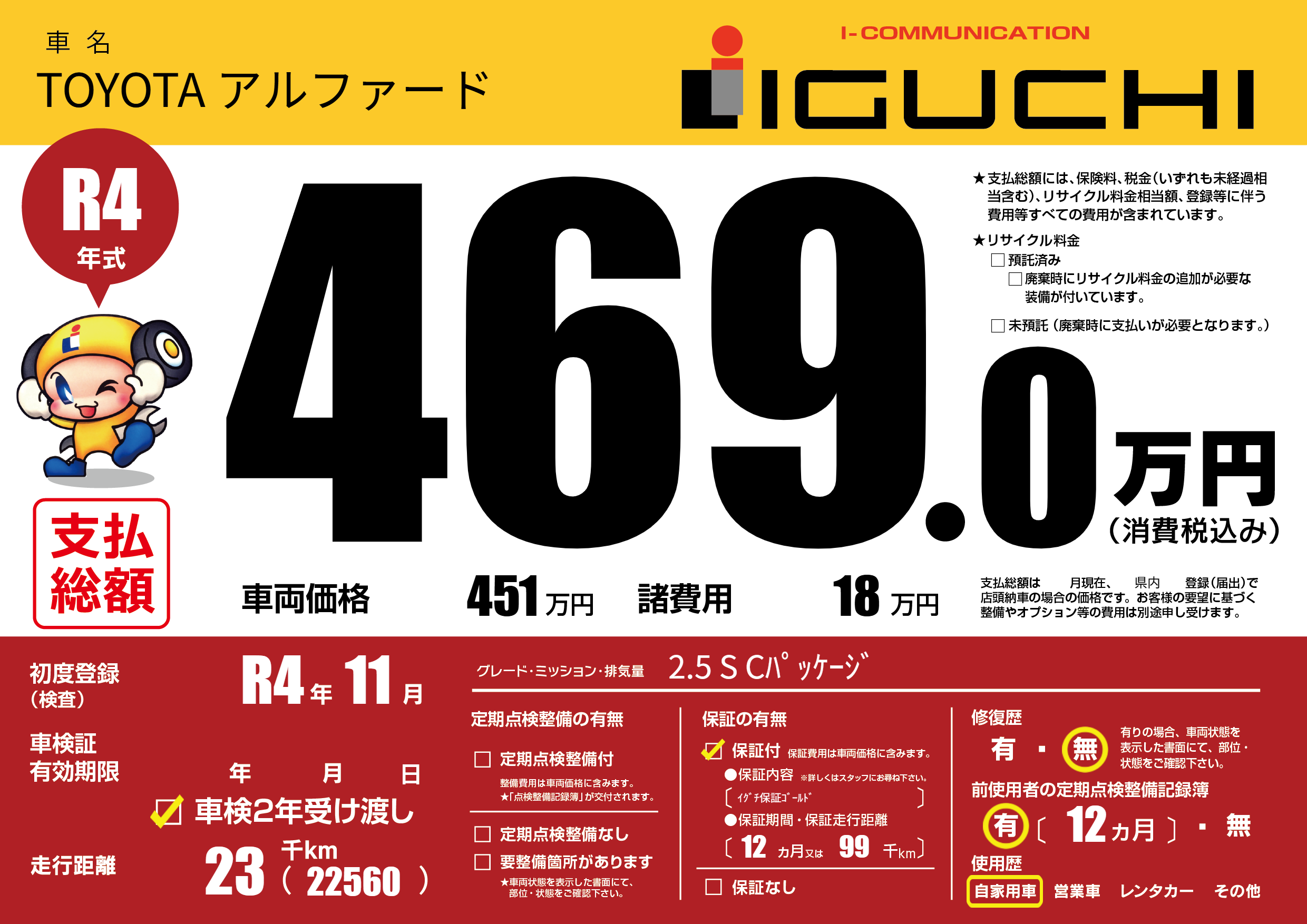 保証付き 保証内容(イグチ保証ゴールド) 12ヶ月または(99)千kmまで |