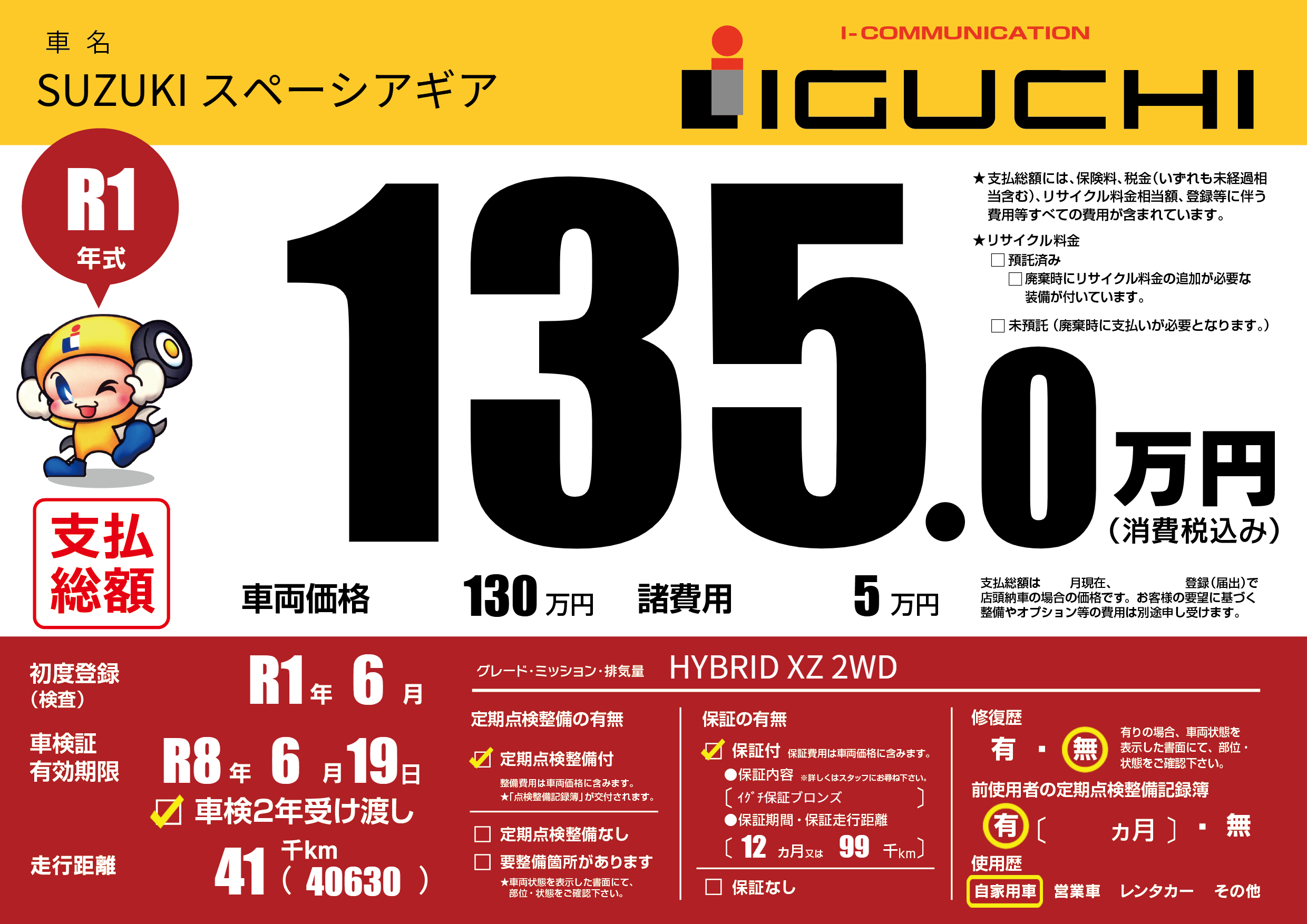 保証付き 保証内容(イグチ保証ブロンズ) 12ヶ月または(99)千kmまで |
