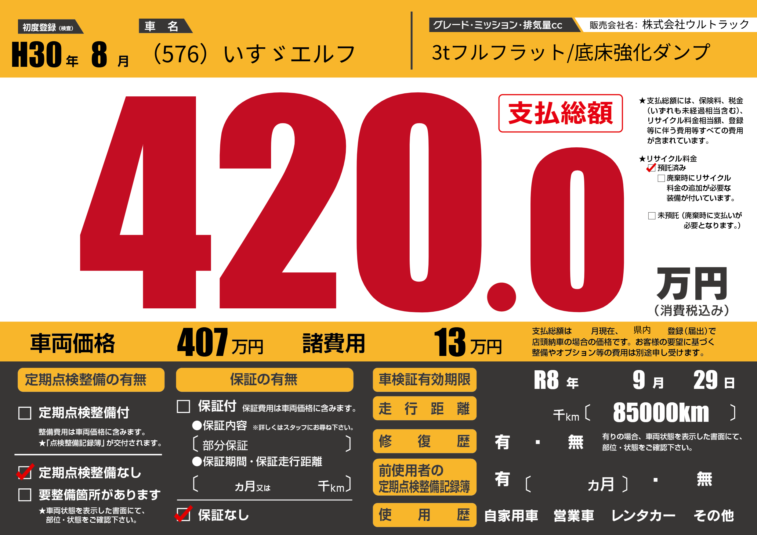保証なし 保証内容(部分保証) ---ヶ月または()千kmまで |
