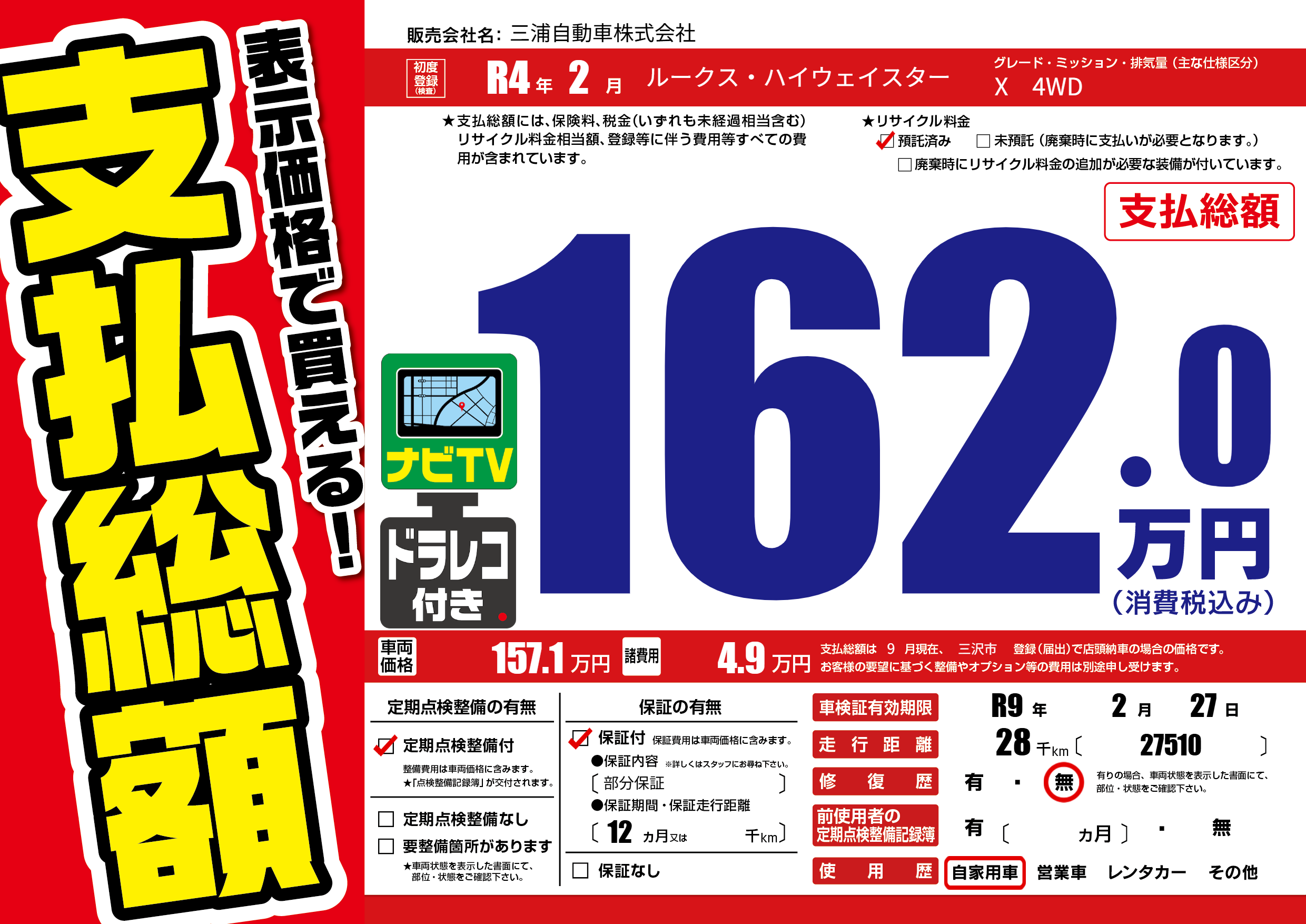 | 走行キロ | 2.8万km | 初年度登録 | R4年2月 |