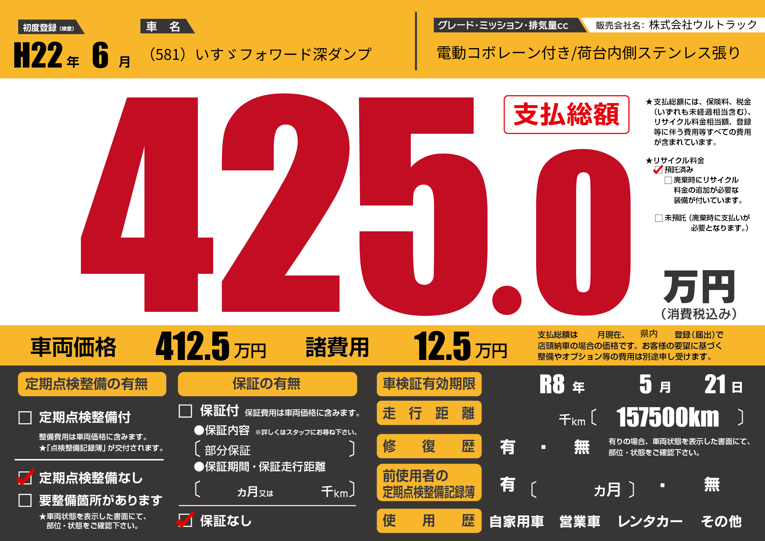 | 車名 | (581)いすゞフォワード深ダンプ | グレード ミッション 排気量 |