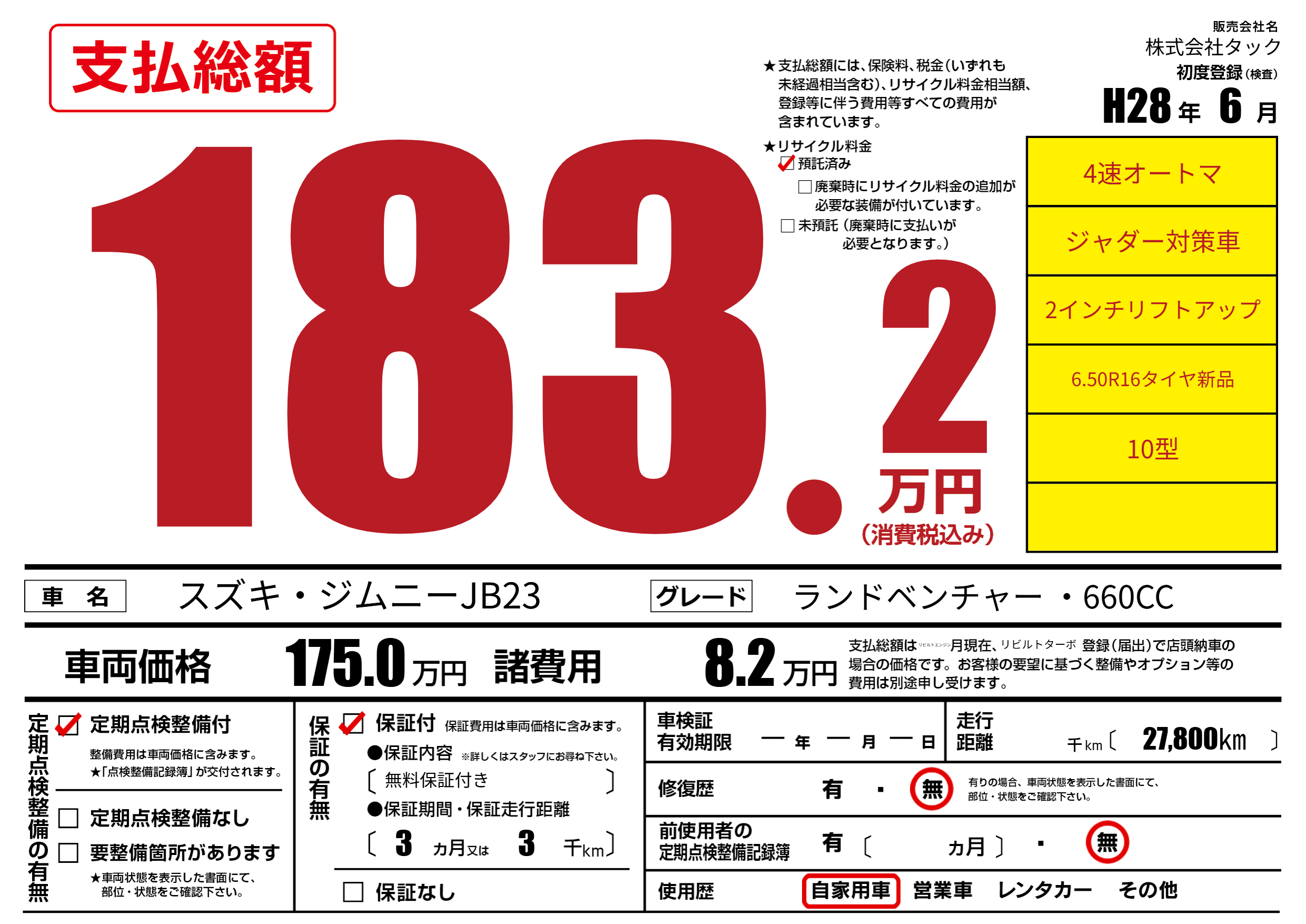 | 車名 | スズキ・ジムニーJB23 | グレード ミッション 排気量 |