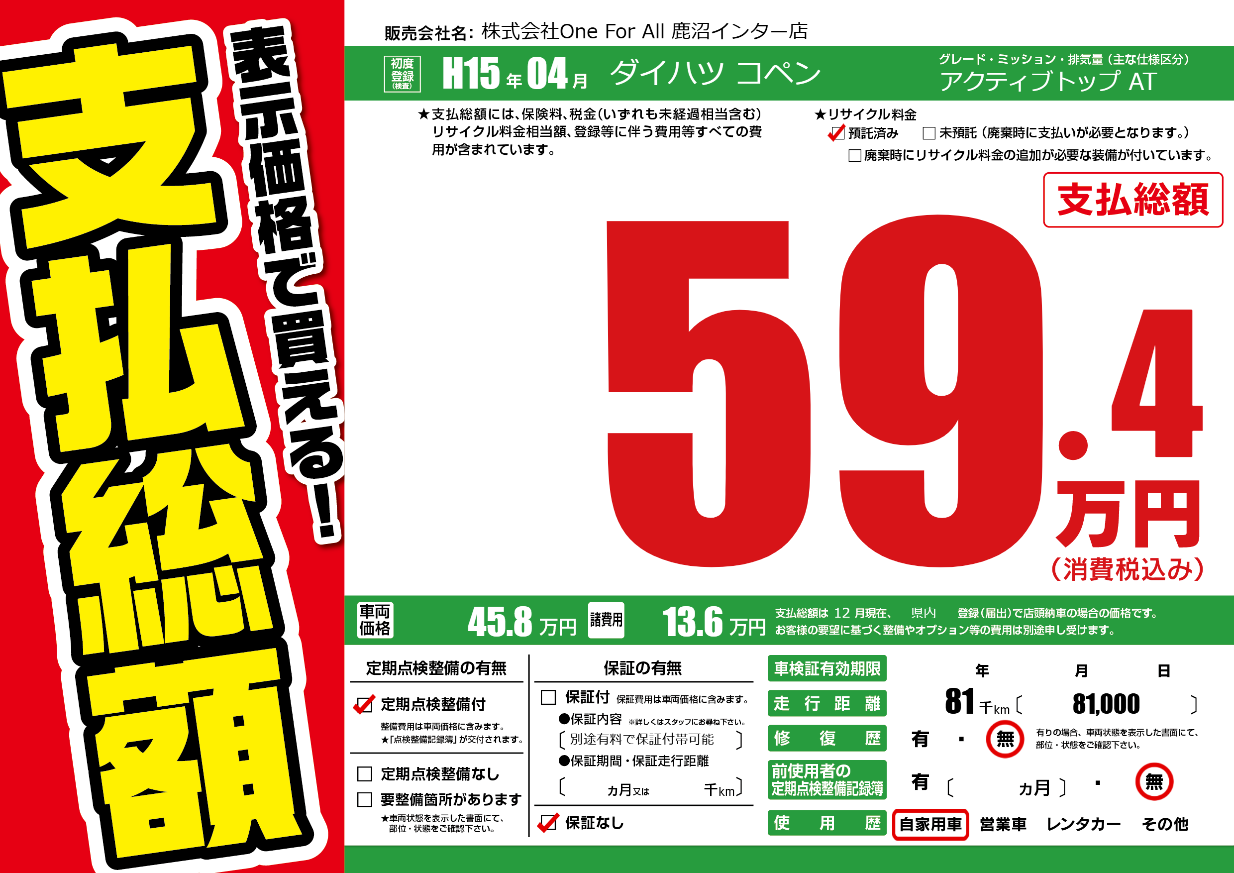 | 車名 | ダイハツ コペン | グレード ミッション 排気量 |