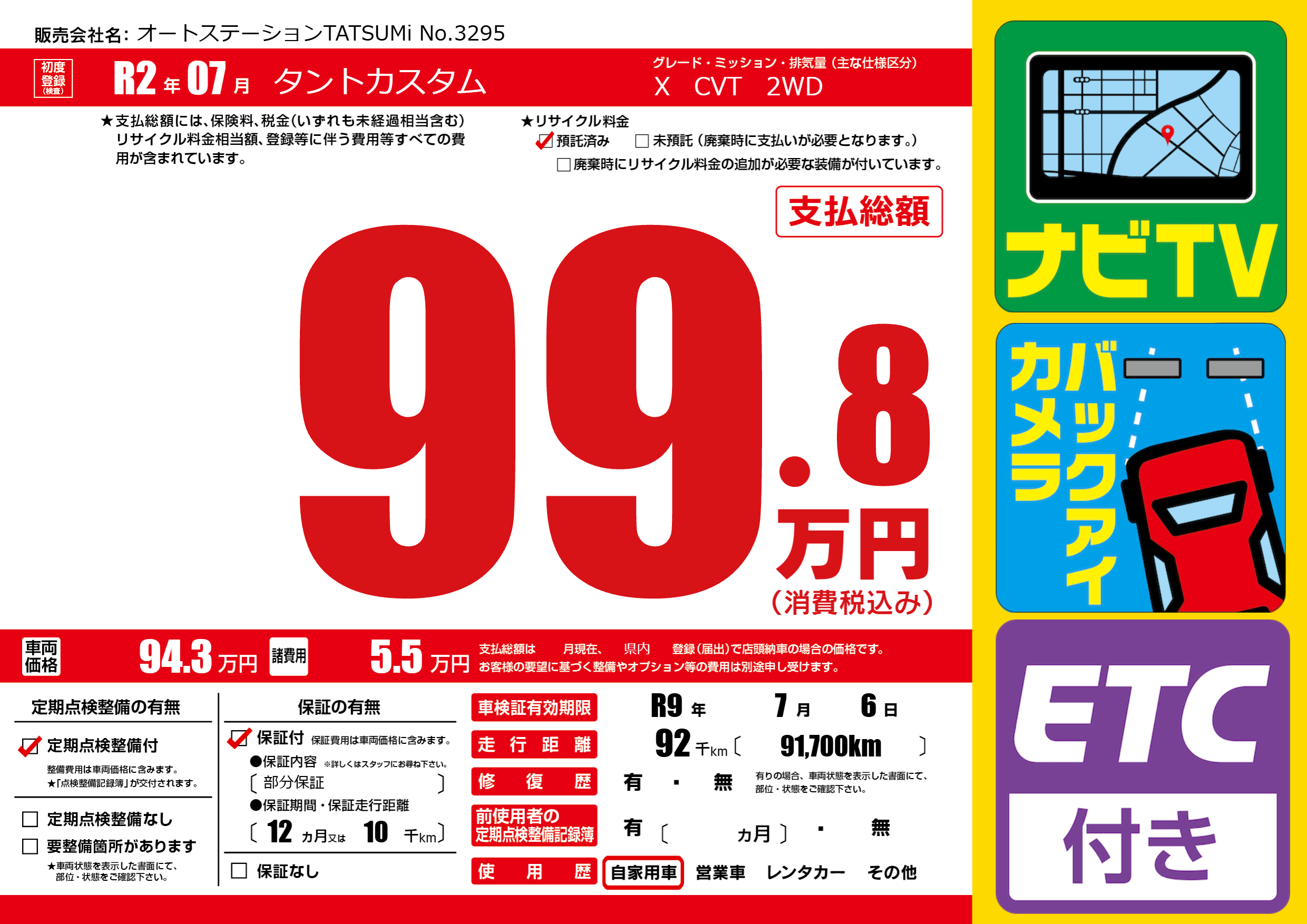 | 車名 | タントカスタム | グレード ミッション 排気量 |