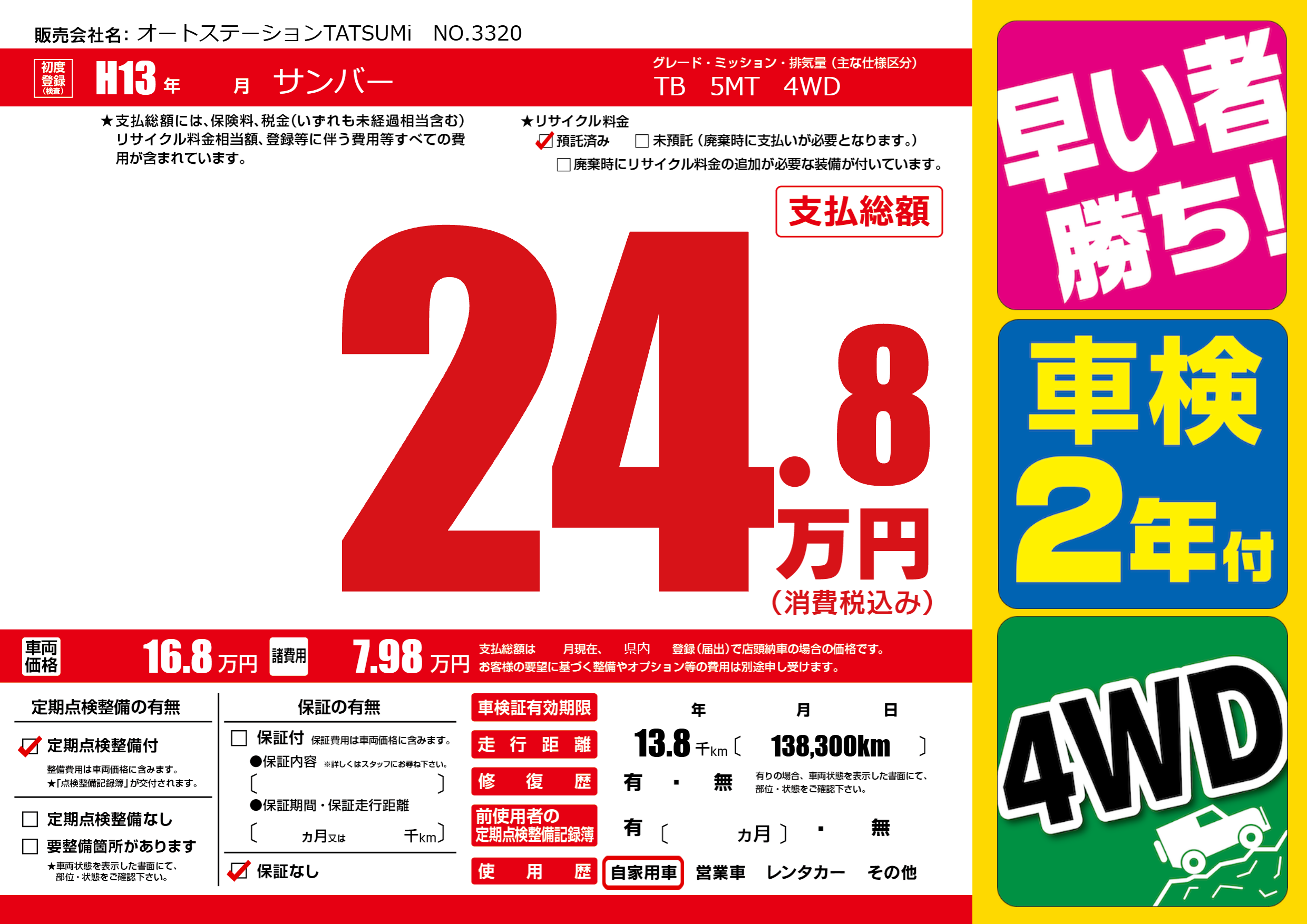 | 走行キロ | 1.3万km | 初年度登録 | H13年---月 |