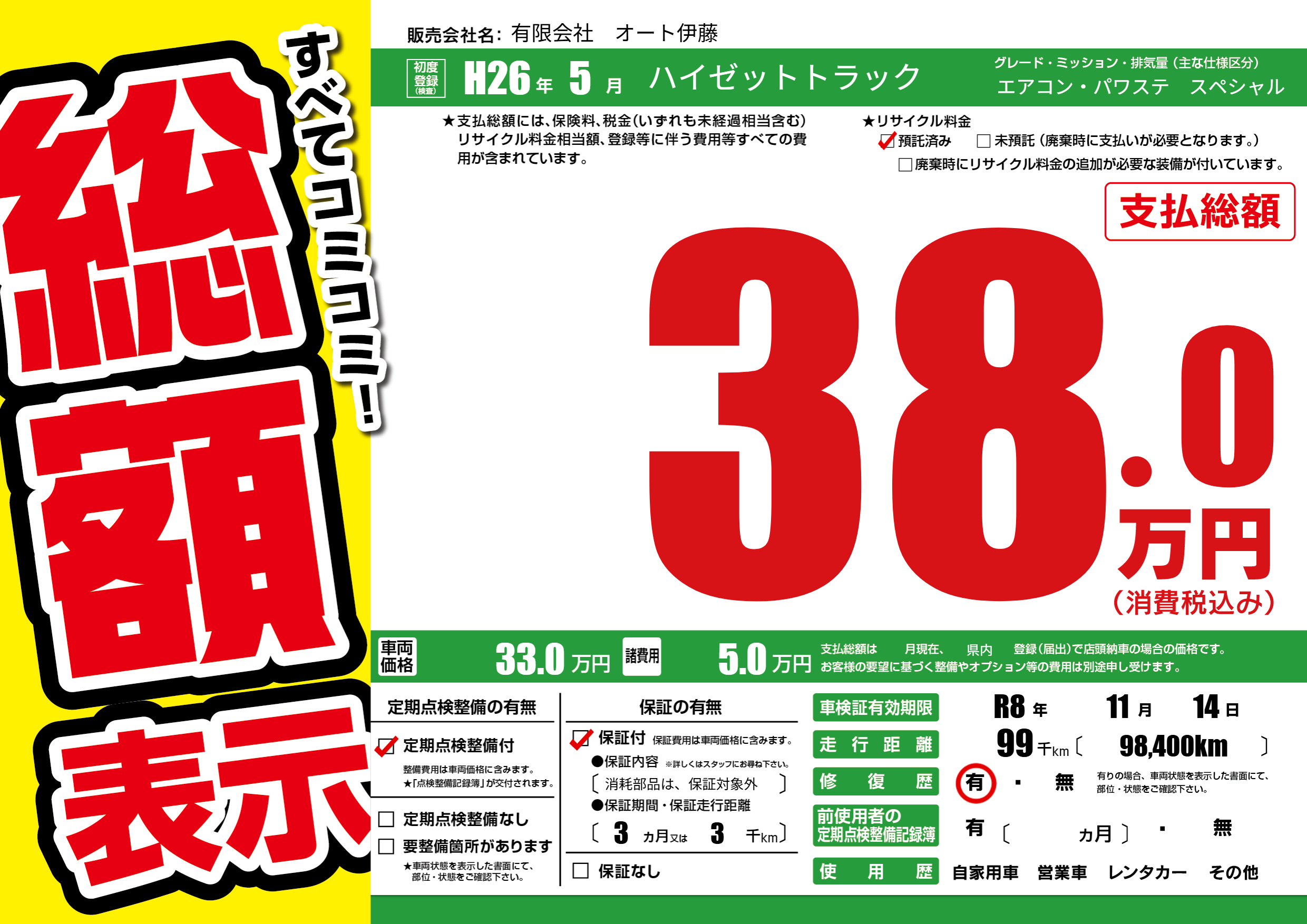 保証付き 保証内容(消耗部品は、保証対象外) 3ヶ月または(3)千kmまで |