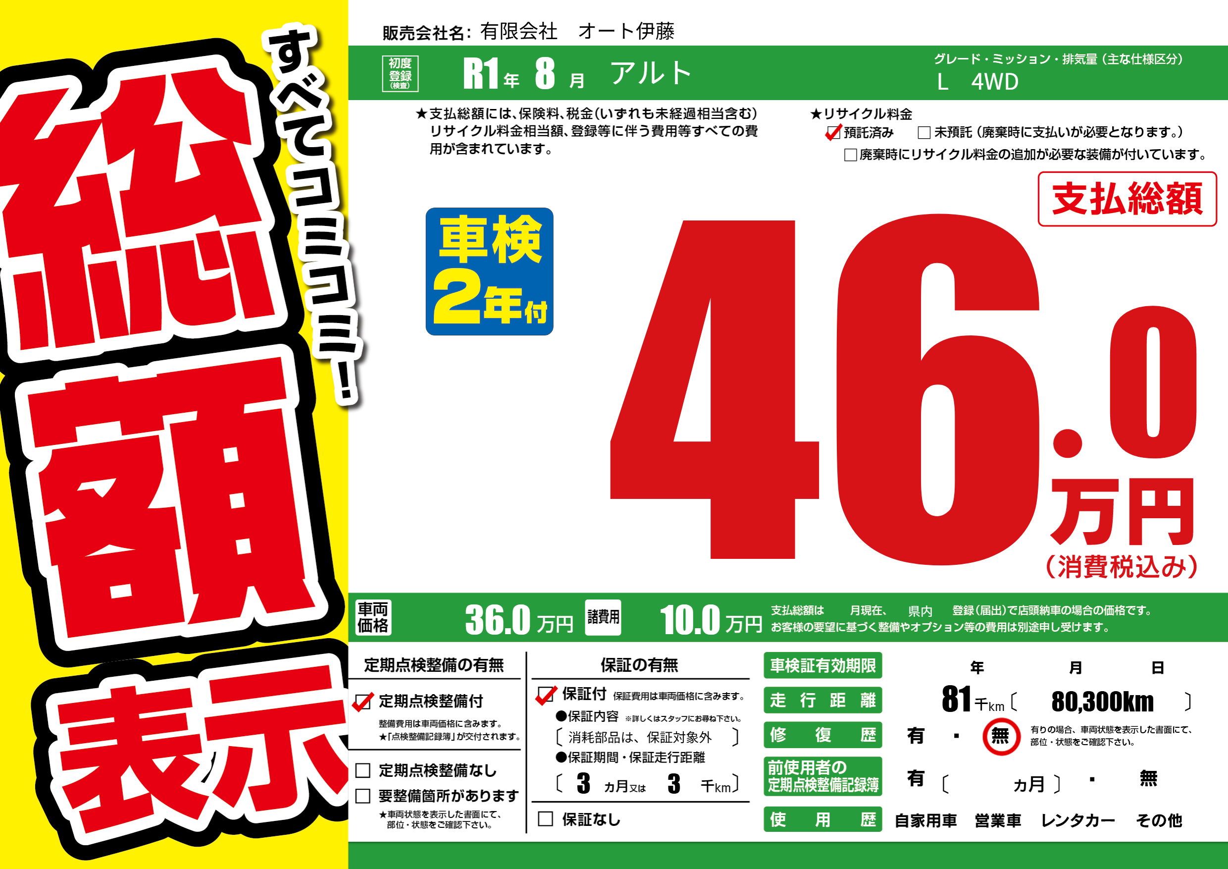 保証付き 保証内容(消耗部品は、保証対象外) 3ヶ月または(3)千kmまで |