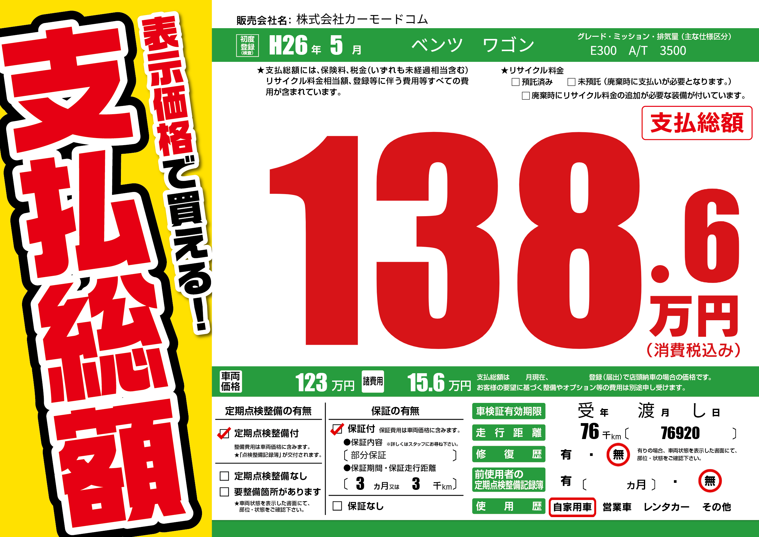 | 車名 | ベンツ ワゴン | グレード ミッション 排気量 |