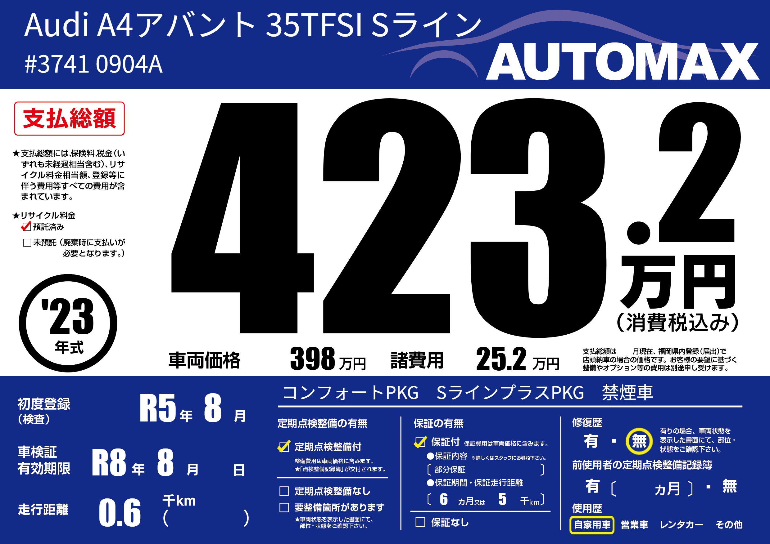 | 車名 | Audi A4アバント 35TFSI Sライン | グレード ミッション 排気量 |
