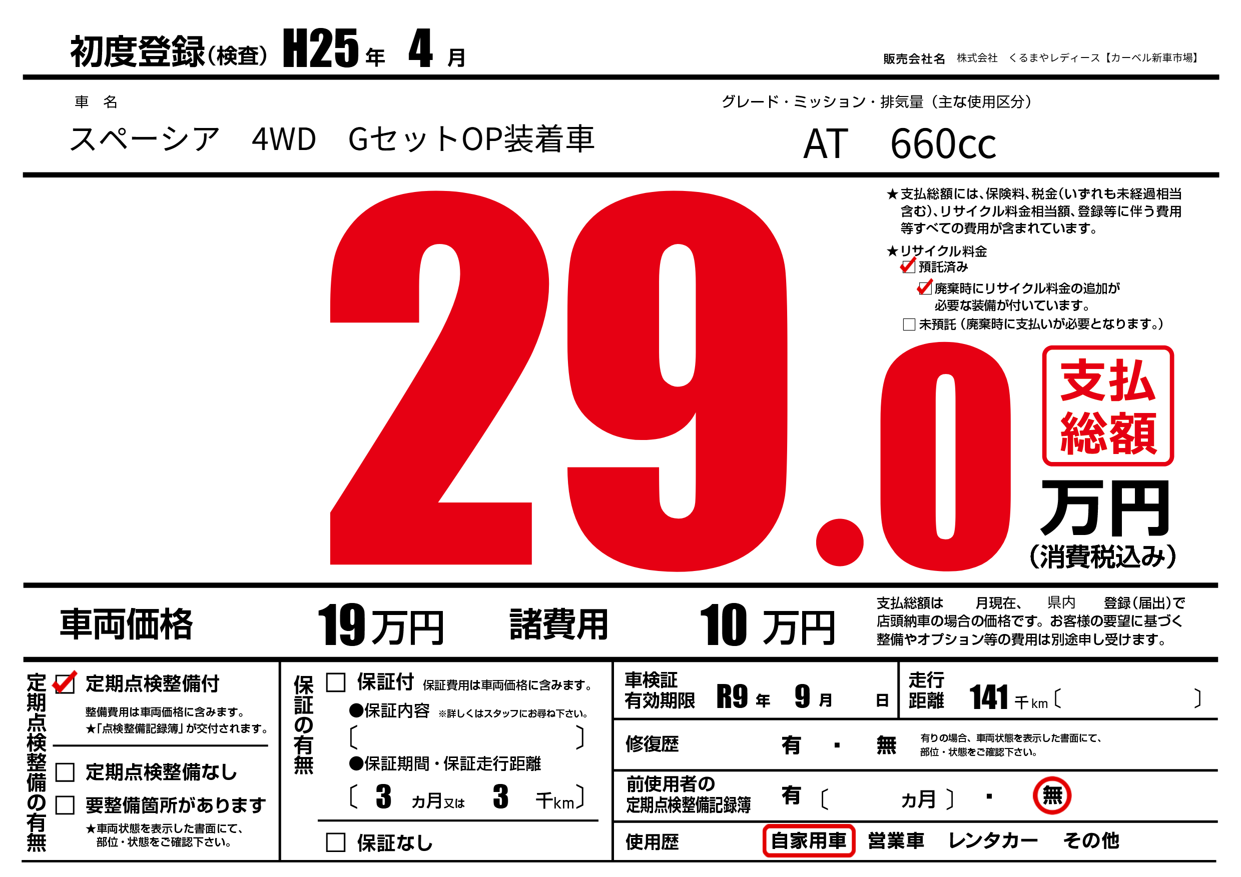 | 車名 | スペーシア 4WD GセットOP装着車 | グレード ミッション 排気量 |