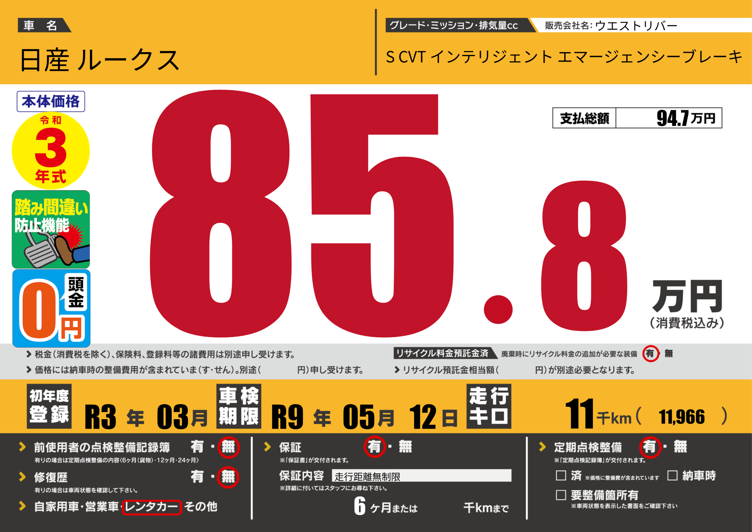 | 走行キロ | 1.1万km | 初年度登録 | R3年03月 |