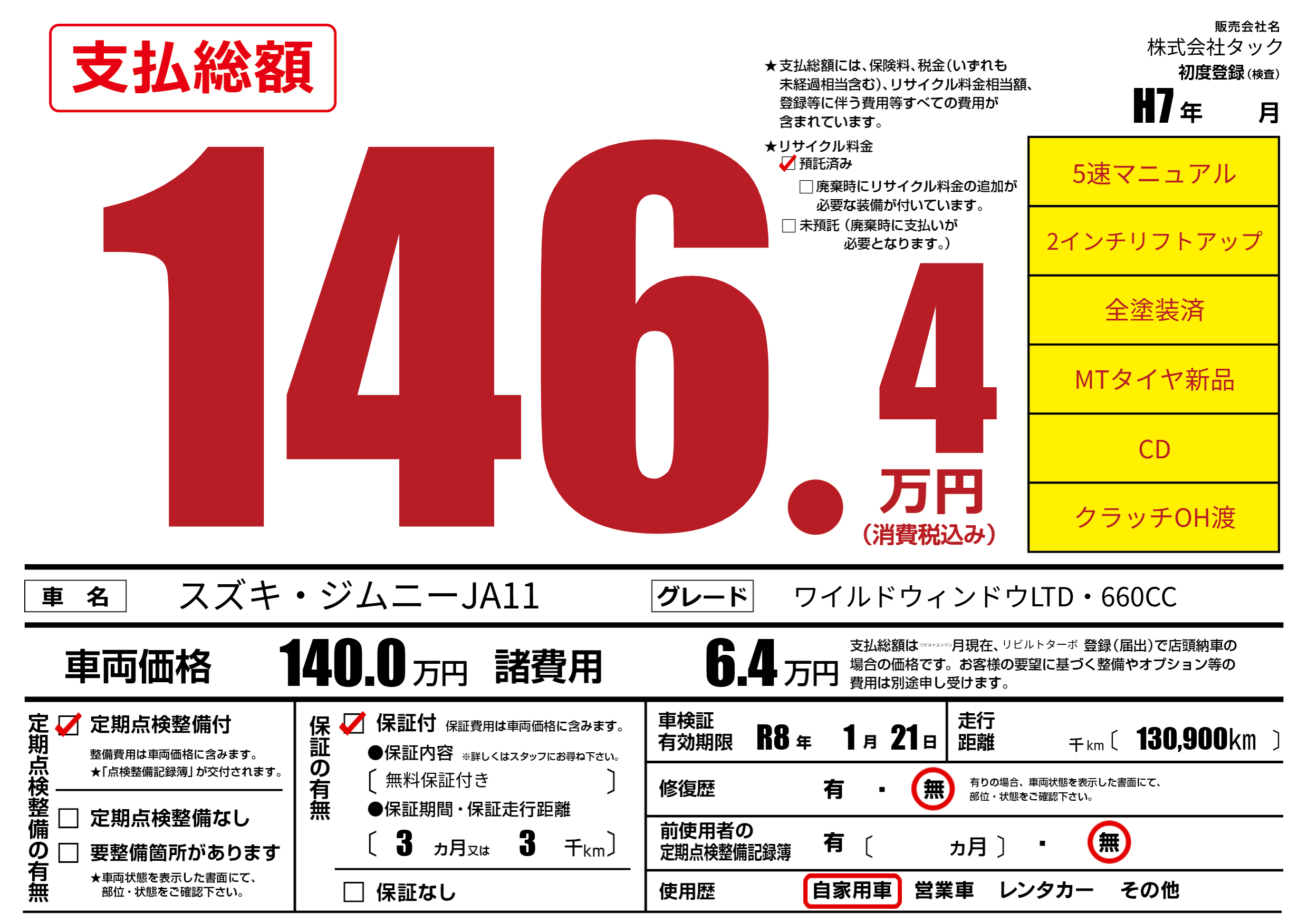 | 車名 | スズキ・ジムニーJA11 | グレード ミッション 排気量 |