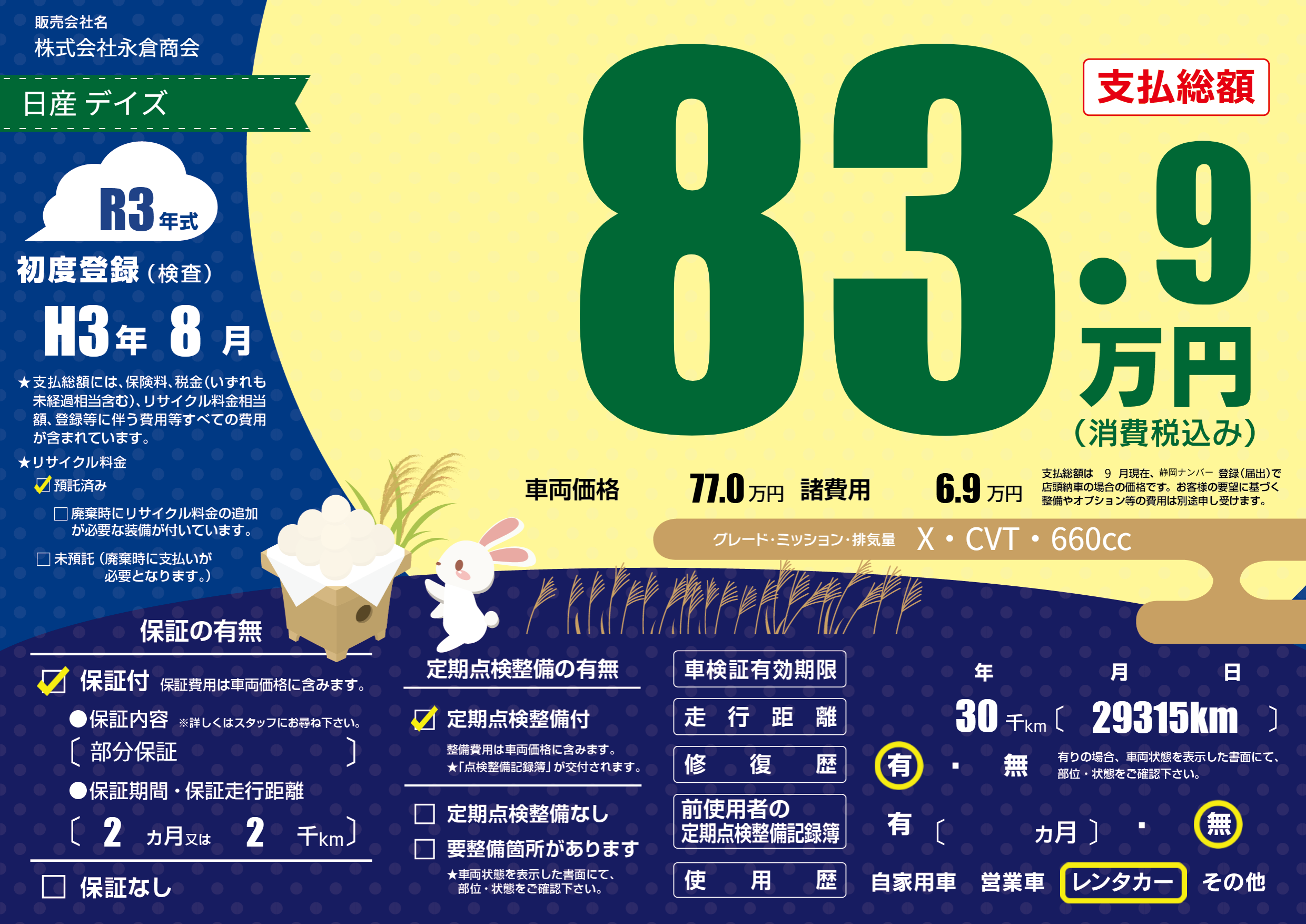 | 車名 | 日産 デイズ | グレード ミッション 排気量 |