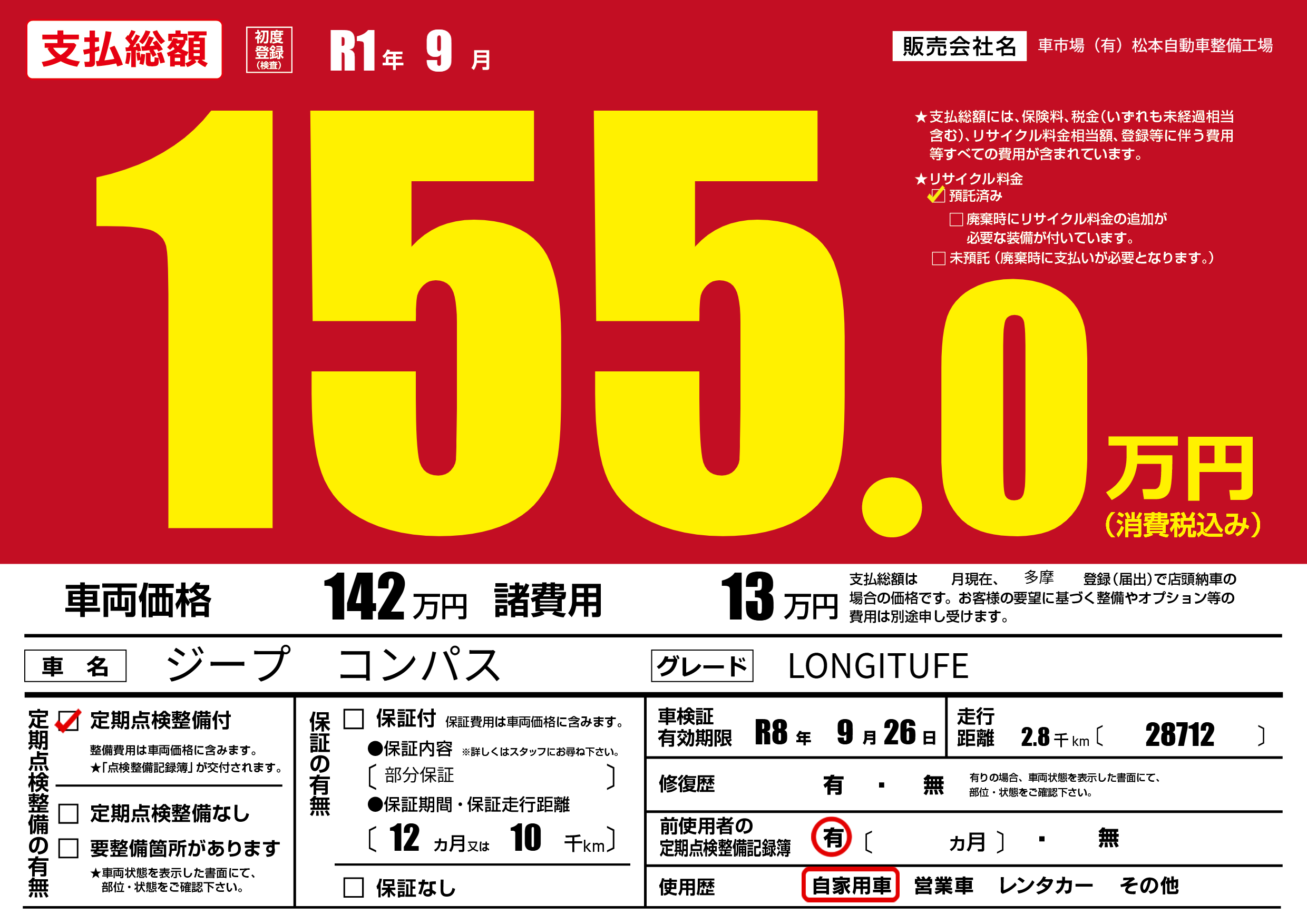| 車名 | ジープ コンパス | グレード ミッション 排気量 |