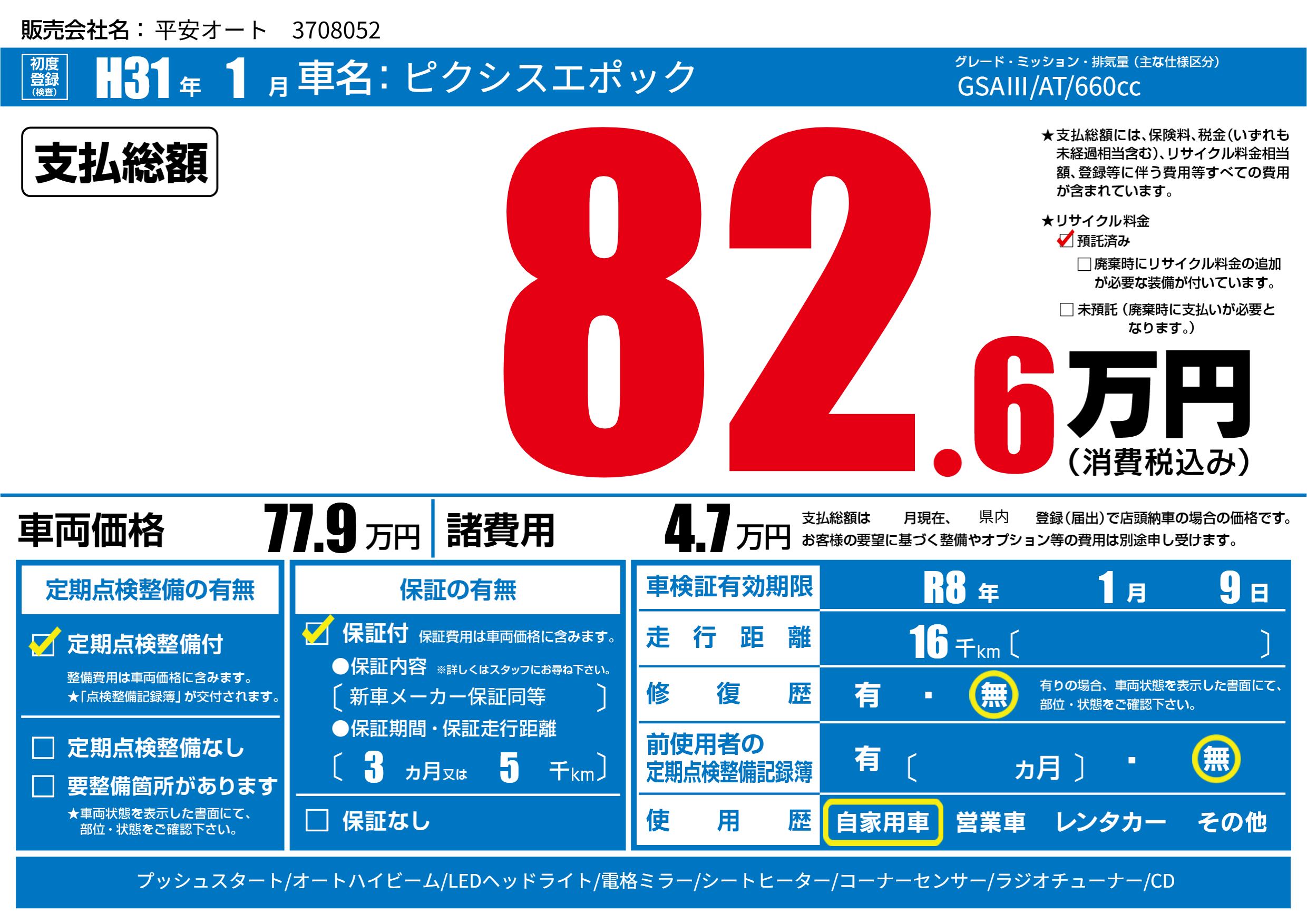 | 車名 | ピクシスエポック | グレード ミッション 排気量 |