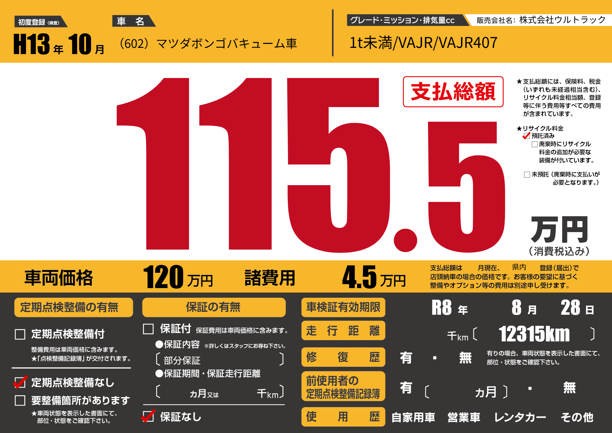 | 車名 | (602)マツダボンゴバキューム車 | グレード ミッション 排気量 |