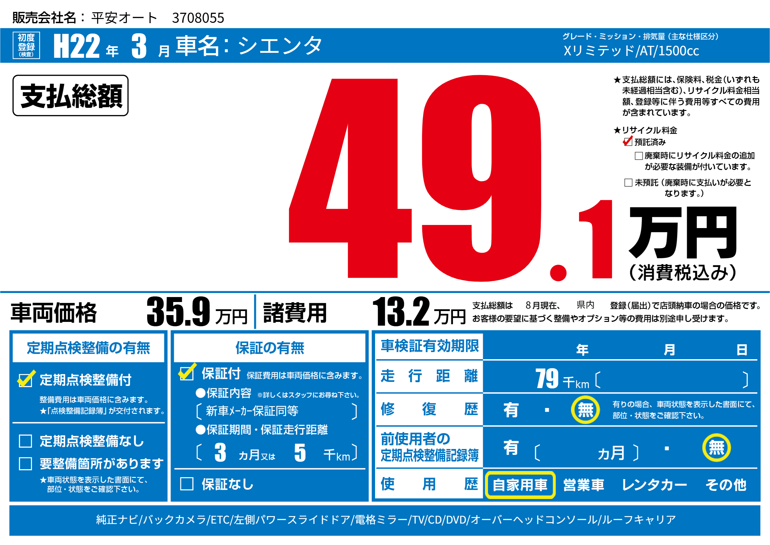 | 車名 | シエンタ | グレード ミッション 排気量 |