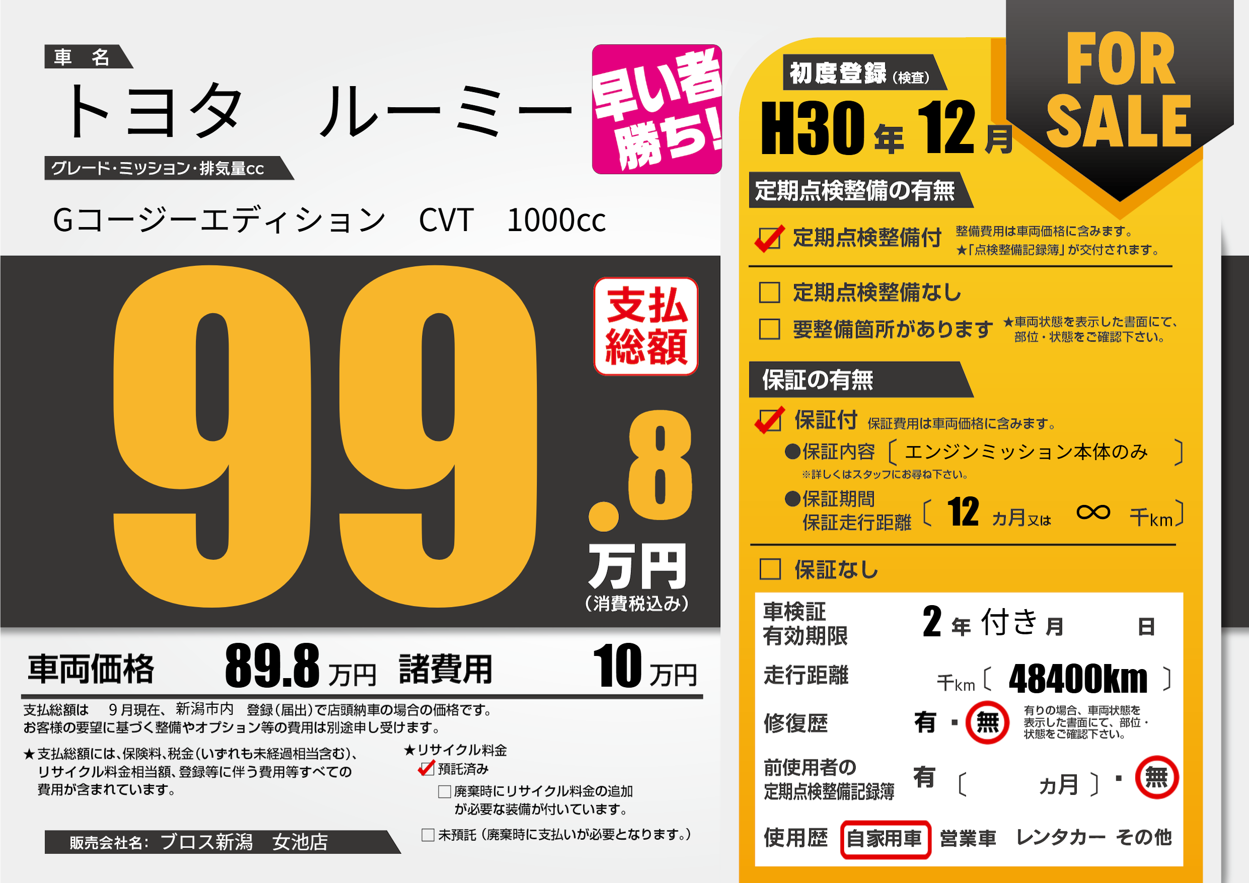| 車名 | トヨタ ルーミー | グレード ミッション 排気量 |