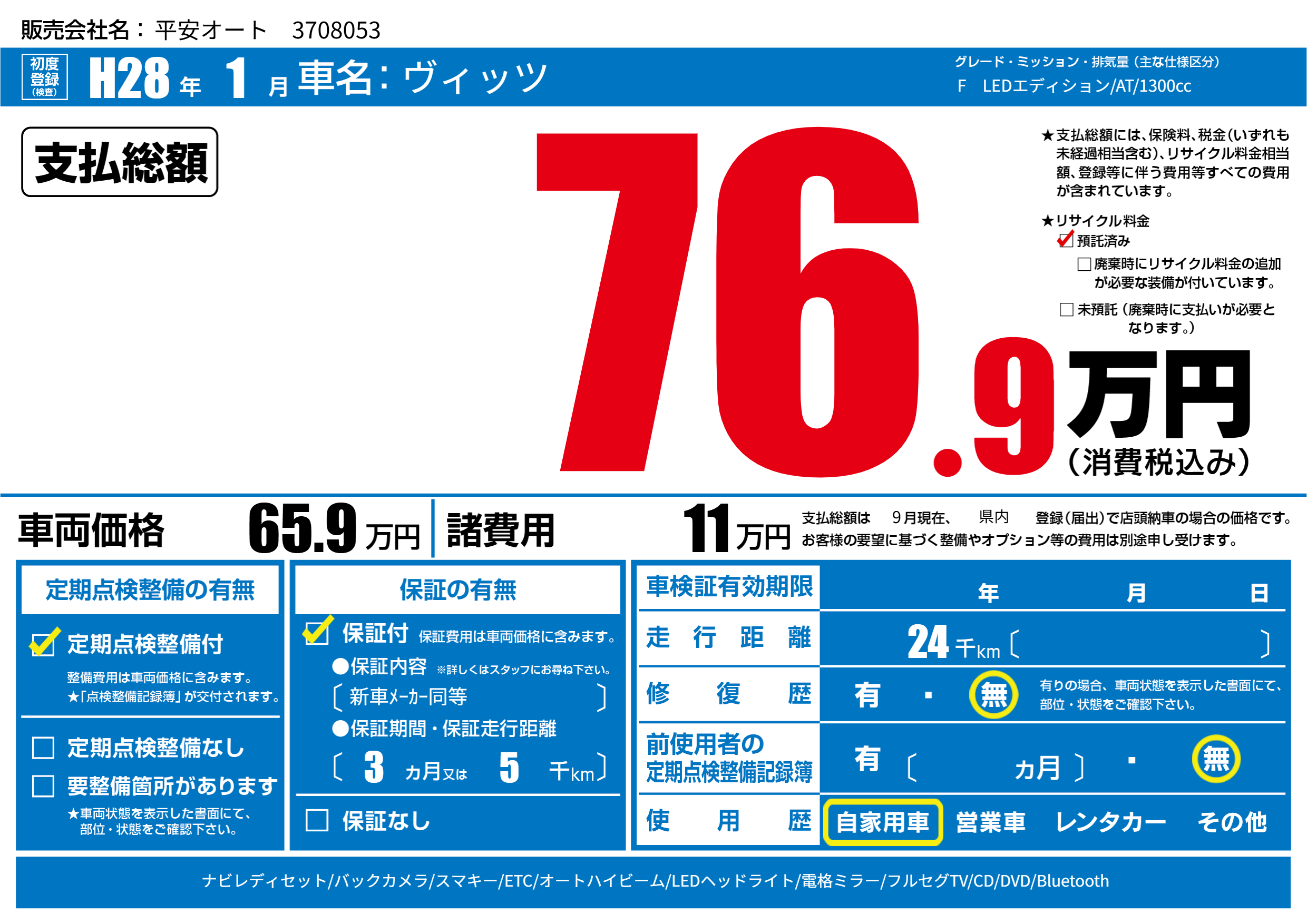 | 車名 | ヴィッツ | グレード ミッション 排気量 |