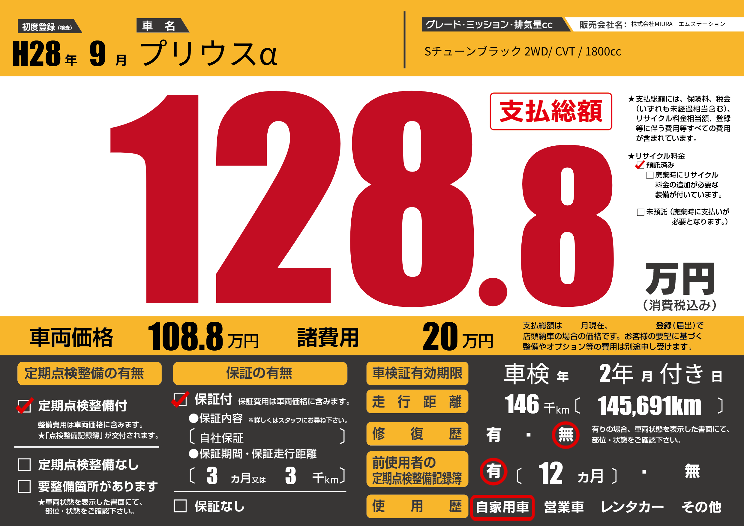 | 走行キロ | 14.6万km | 初年度登録 | H28年9月 |